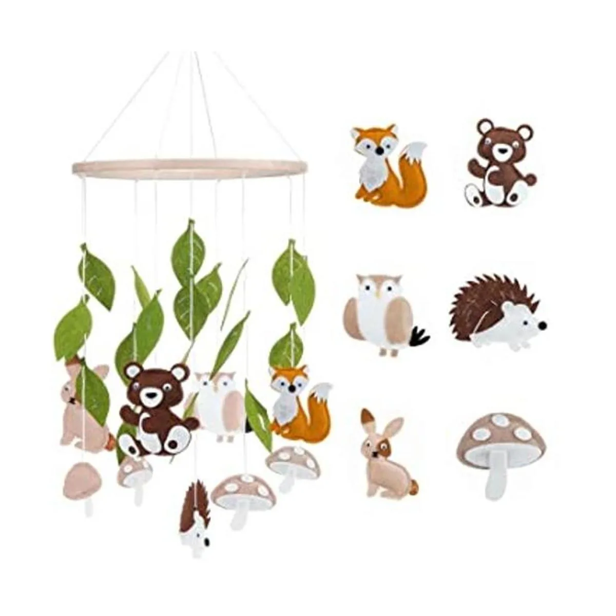 Diseño de animales forestales: obtendrás 1 móvil de guardería forestal con 5 diseños de animales pequeños, incluyendo zorro, búho, oso pardo, conejo, erizo, así como lindos hongos y hojas, que pueden obtener fácilmente el amor de tu bebé