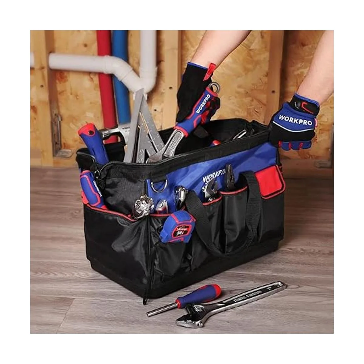 WORKPRO Bolsa de herramientas de 18 pulgadas con base moldeada impermeable, bolsa organizadora de herramientas abierta con múltiples bolsillos, correa de hombro ajustable