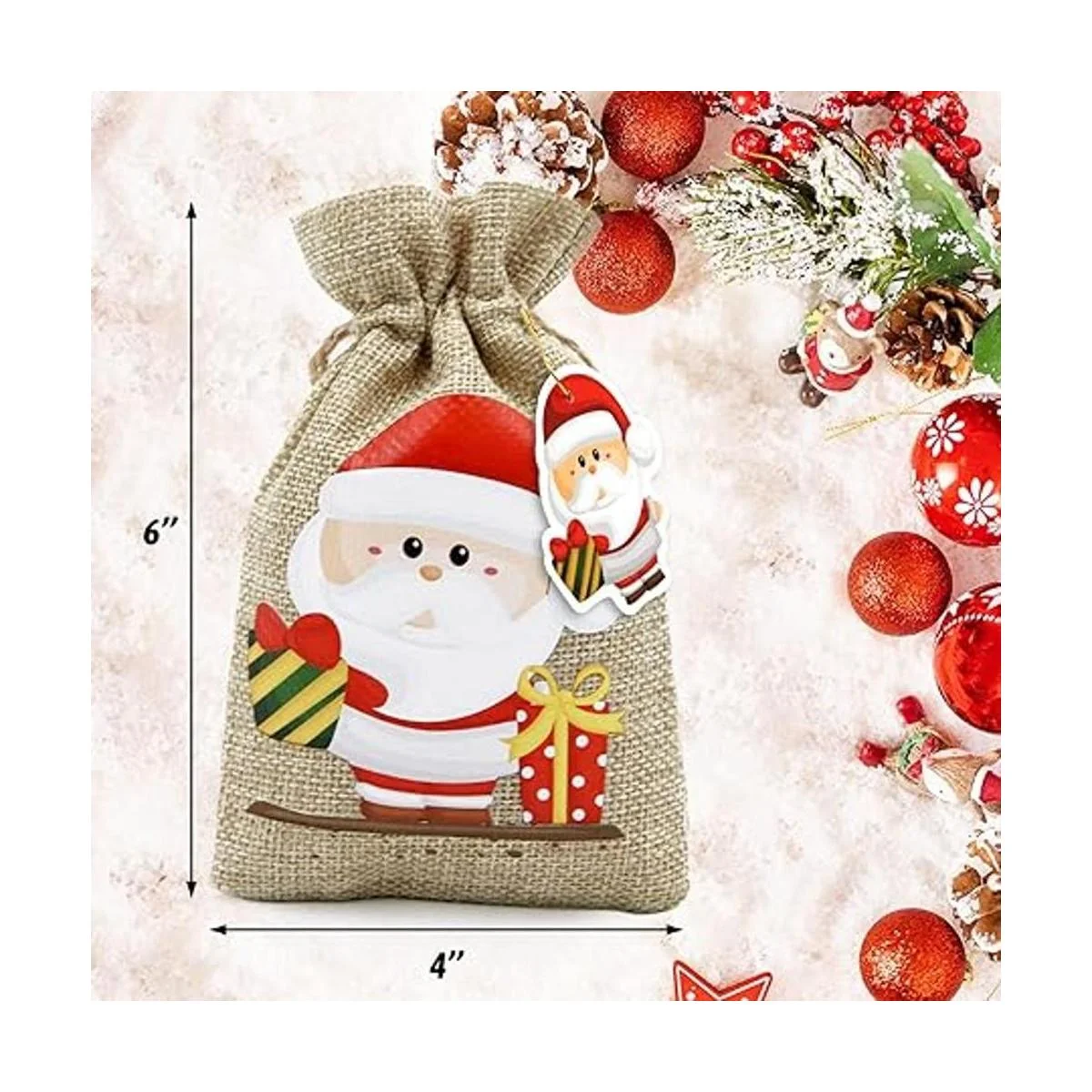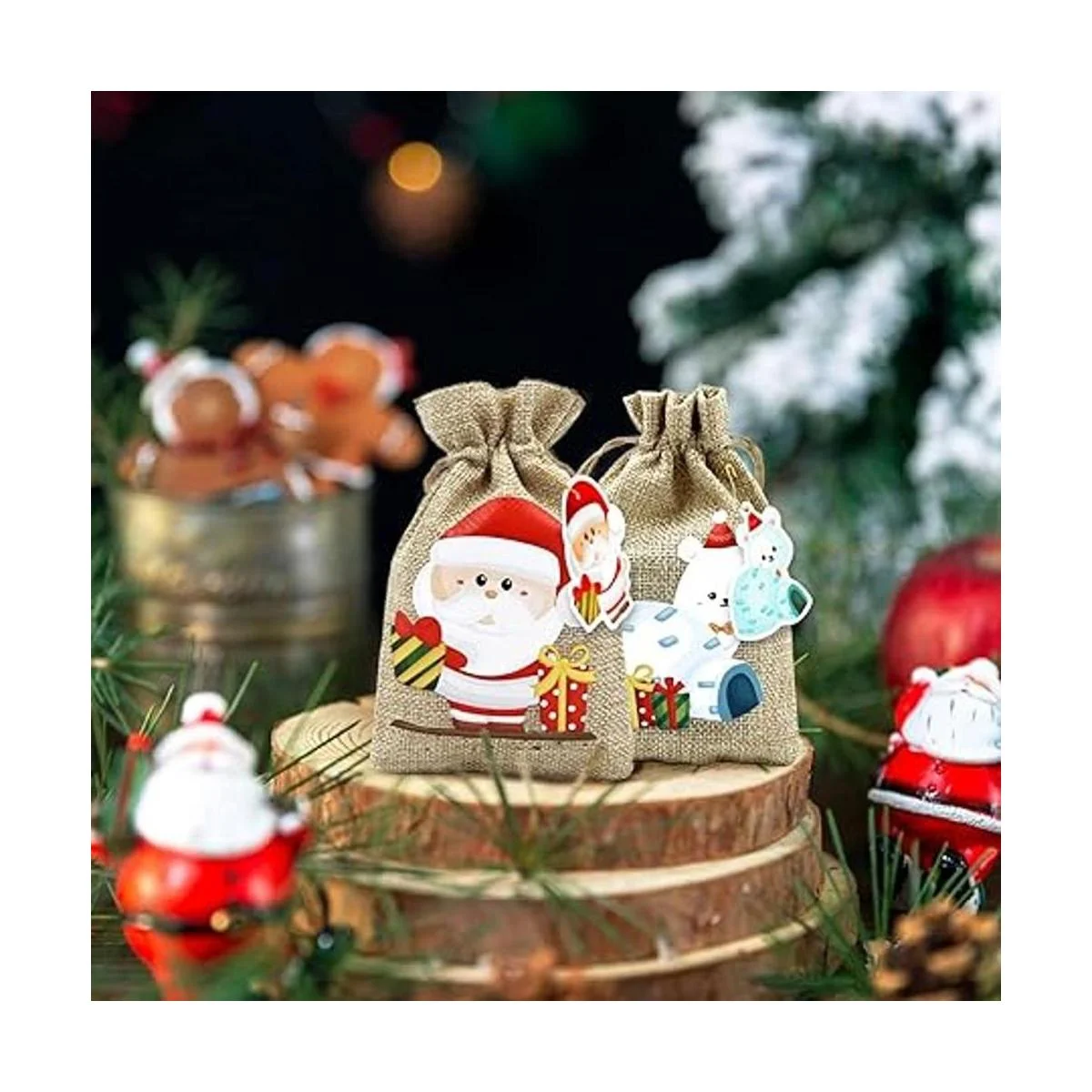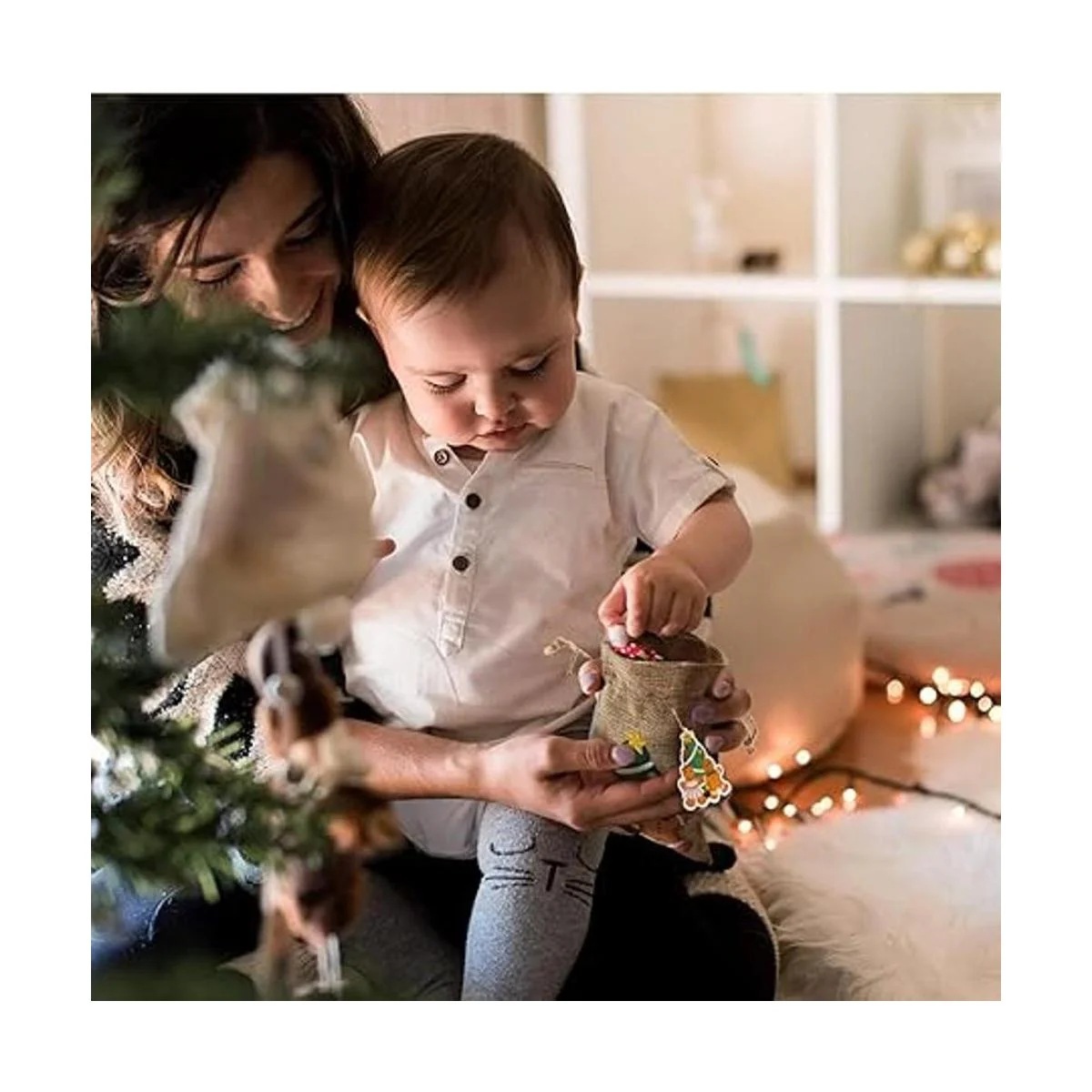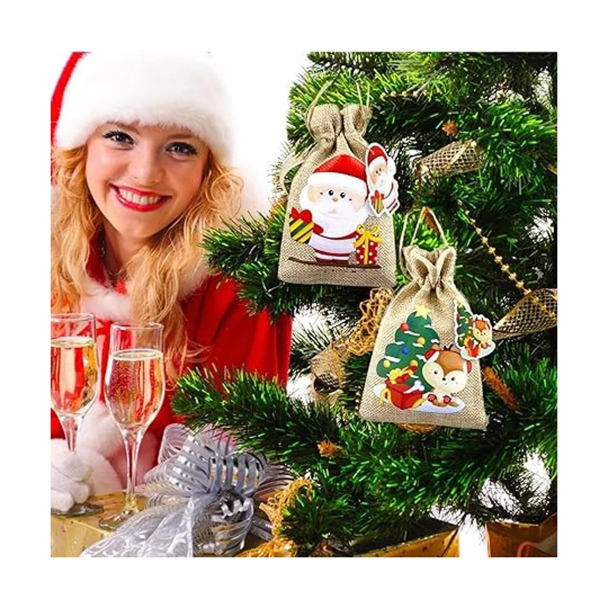 WorldBazaar Bolsas de regalo pequeñas de yute de Navidad con etiquetas de cordón, bolsas de regalo de lino, bolsas decorativas para regalos de fiesta de Navidad, 24 unidades paquete de 1