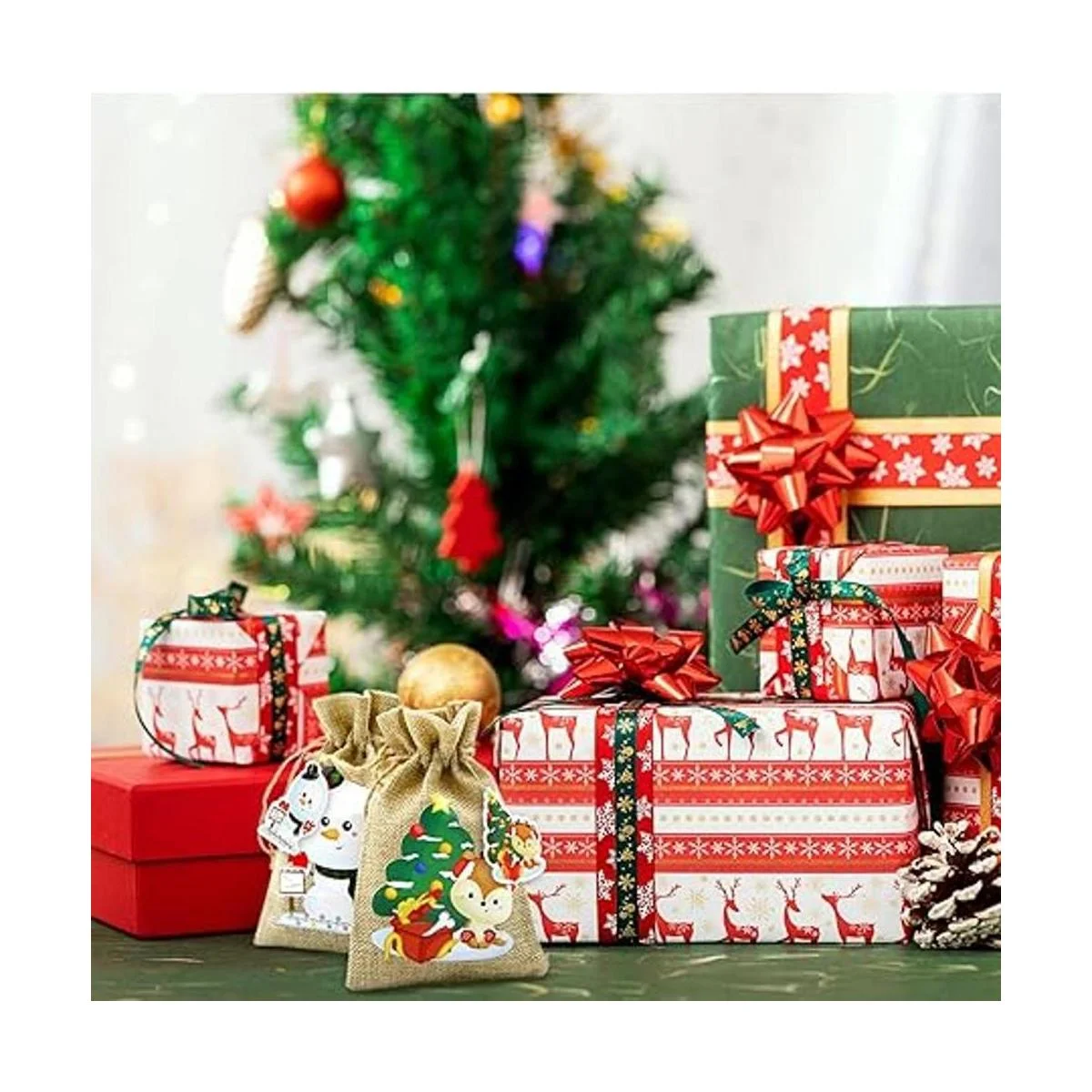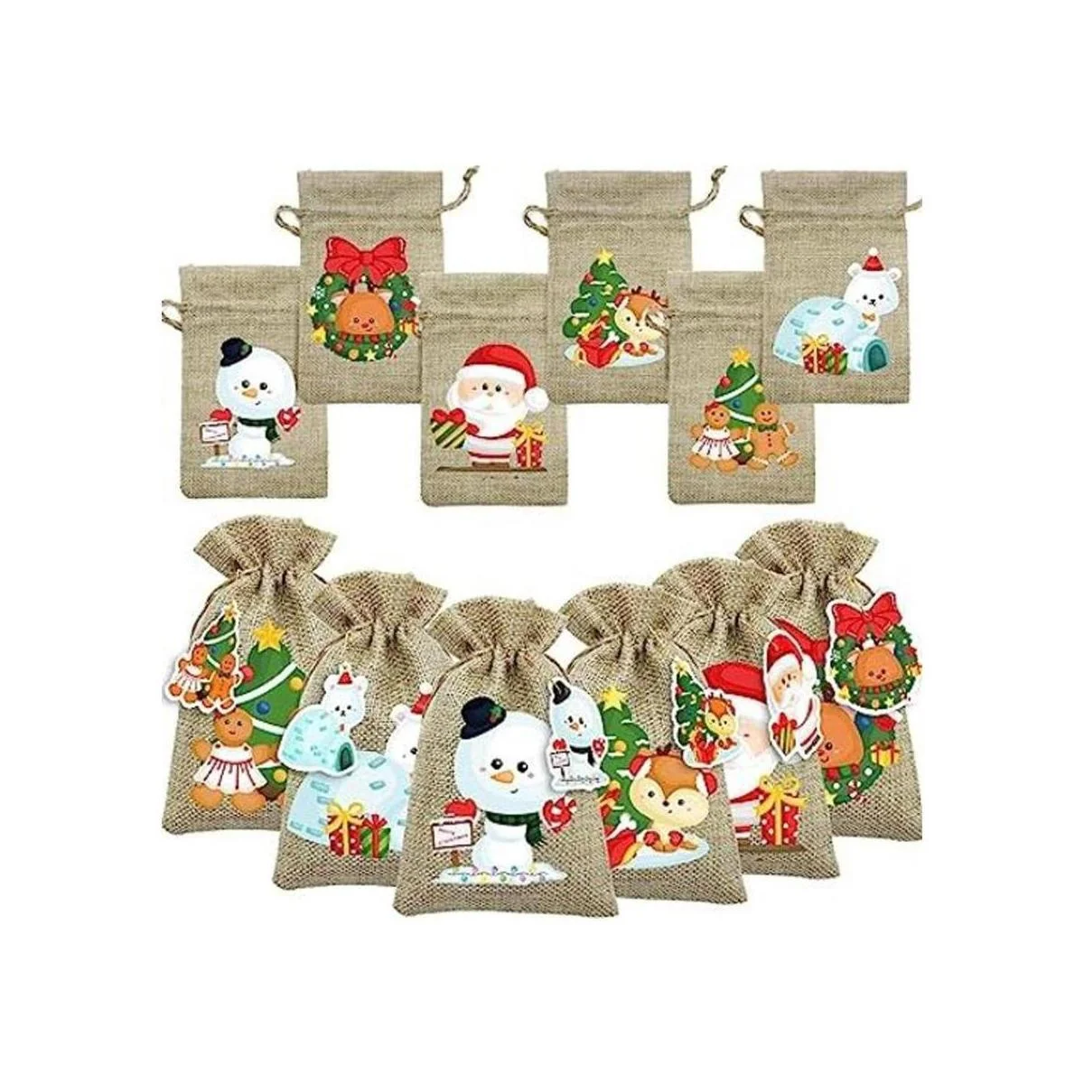 El paquete incluye: 24 bolsas de regalo pequeñas de arpillera con tamaño de 6 x 4 pulgadas. 6 diseños diferentes son adecuados para representar elementos navideños.