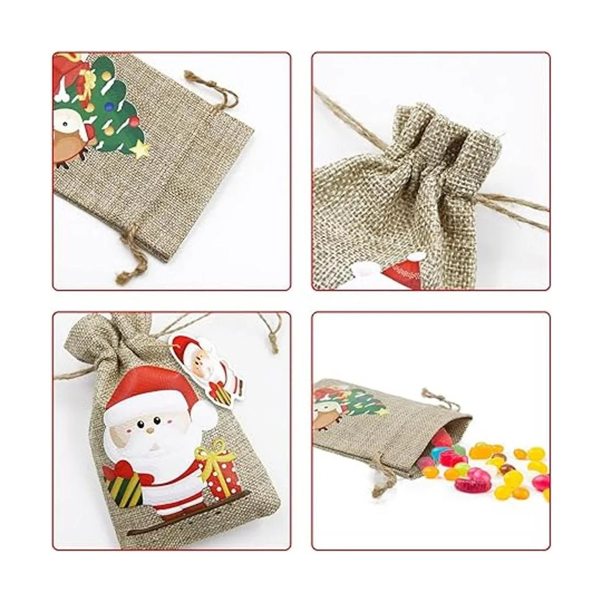 Hermoso patrón: bonitos y delicados patrones de Navidad, Papá Noel, muñeco de nieve, árbol de Navidad, reno y hombre de jengibre están impresos con 6 bonitos diseños de Navidad. El diseño de cordón es fácil de sellar las bolsas de lino firmemente y evitar que se caigan.