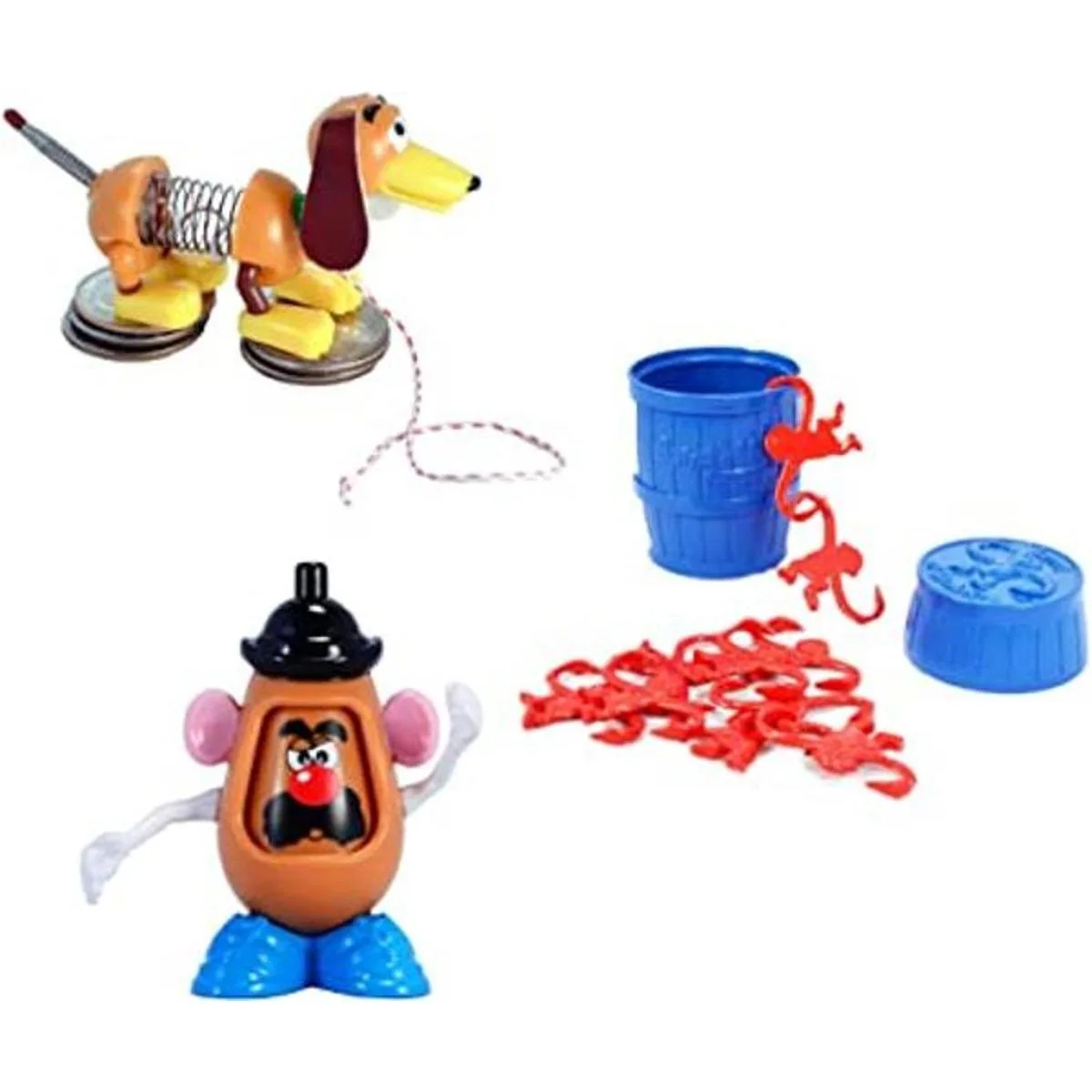 Incluido en el juego: 1 de cada uno de los juguetes más pequeños del mundo cabeza de patata, perro Slink, barril de monos