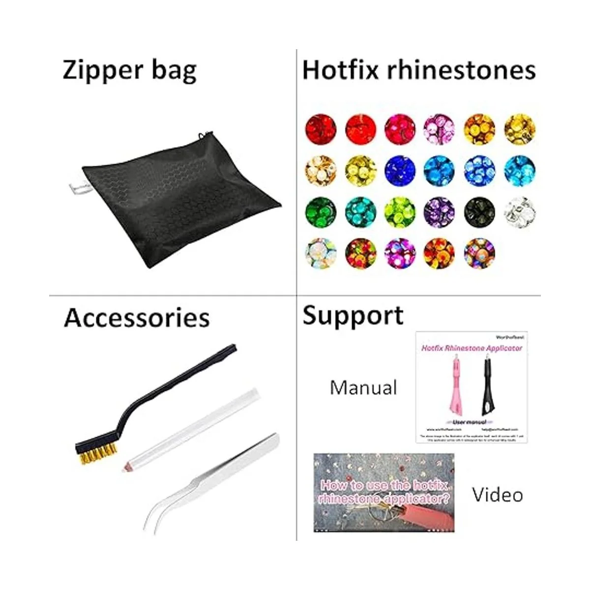 Kit de iniciación todo incluido en 1 bolsa con cremallera: kit de cuentas Badazzbeads que incluye máquina de diamantes de imitación de bolígrafo Hotfix, 6 puntas aplicadoras Hotfix, 1 caja de diamantes de imitación Hotfix en 12 colores sólidos, 1 caja de cristal Hotfix AB y diamantes de imitación transparentes, ambos en 4 tamaños, recogedor de joyas de cera, pinzas, cepillo, soporte de metal, bandejas, manual. Muy cómodo de usar con todas las herramientas necesarias, nunca se ensucia