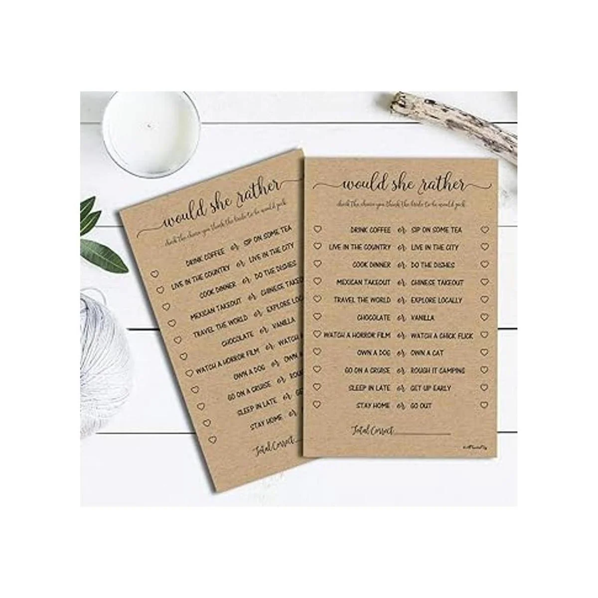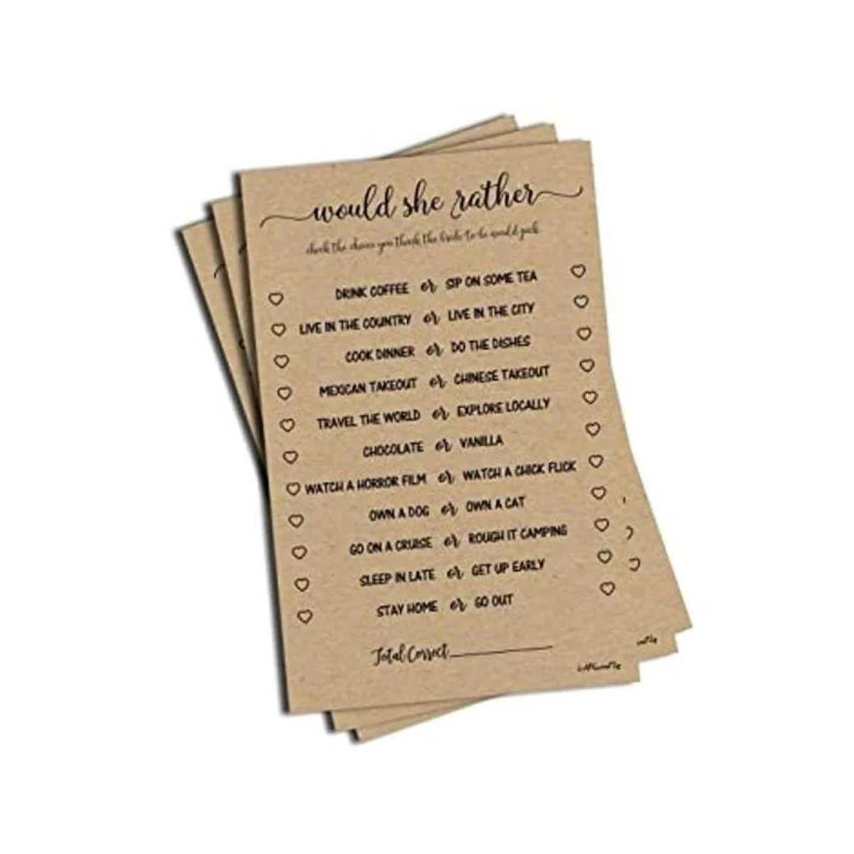 Would She Rather Game Kraft 50 hojas, juego rústico de despedida de soltera o despedida de soltera, ensayo de compromiso impreso hojas de tamaño grande