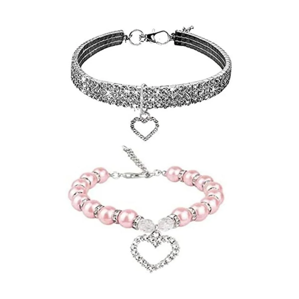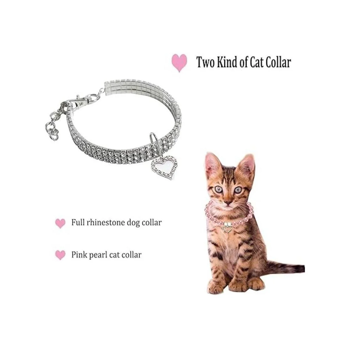 Gran combinación: preparamos dos bonitos collares para tu adorable mascota, 1 collar de perro completo con diamantes de imitación y 1 collar de perlas para perros. La moda combinada y los elegantes harán que tu cachorro sea más bonito.