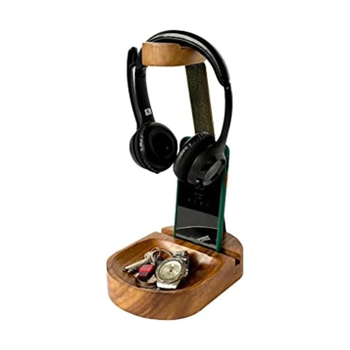 Wrightmart Soporte para auriculares, de madera, soporte universal para auriculares, colgador de auriculares de escritorio con ranura para teléfono celular, decoración para un espacio de trabajo de oficina ocupado, gran captura todas las base, bandeja de joyería para reloj, almacenamiento de llaves