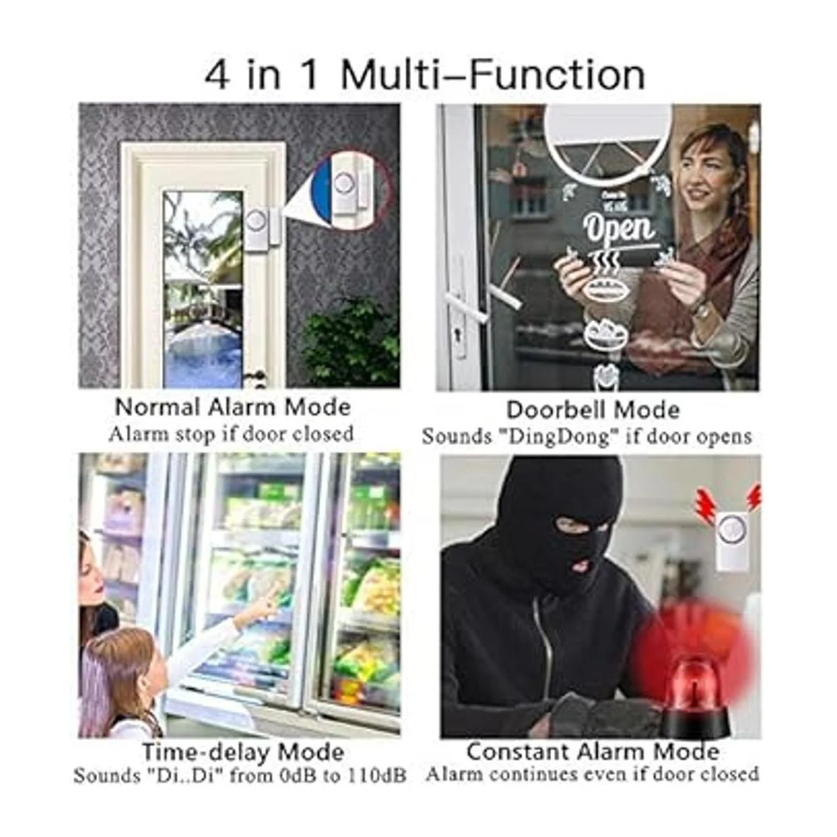 Sensores de alarma de ventana con 4 modos: no solo ajuste de encendido/apagado, sino también alarma general, alarma constante, alerta de puerta cerrada y modo de timbre. Puedes ajustar fácilmente el modo de acuerdo a tus necesidades. Ideal para el hogar, garaje, caravana y almacén, seguridad de los niños, también congeladores y refrigeradores