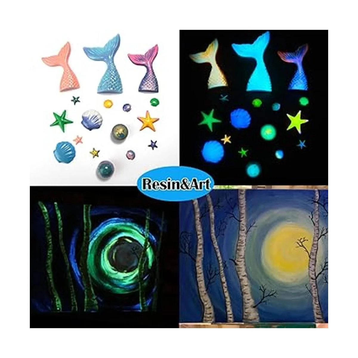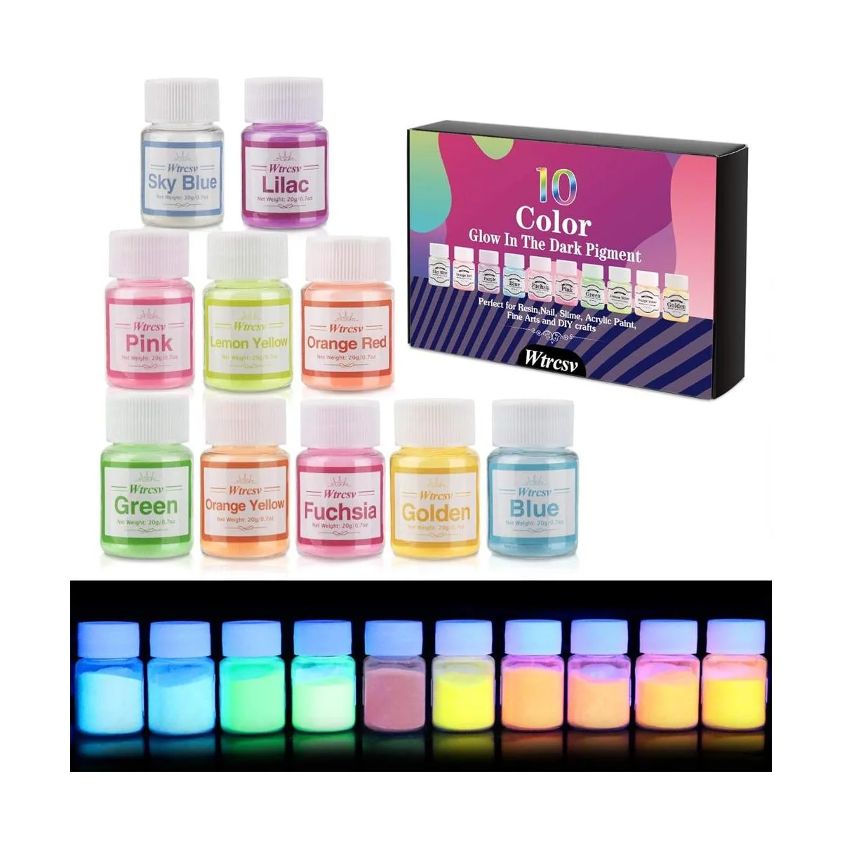 Wtrcsv Polvo de pigmento que brilla en la oscuridad, polvo luminoso de resina epoxi de 10 colores, polvo de seguridad no tóxico para pintura acrílica, slime, uñas, resina, conciertos o bricolaje, 0.7 onzas cada uno