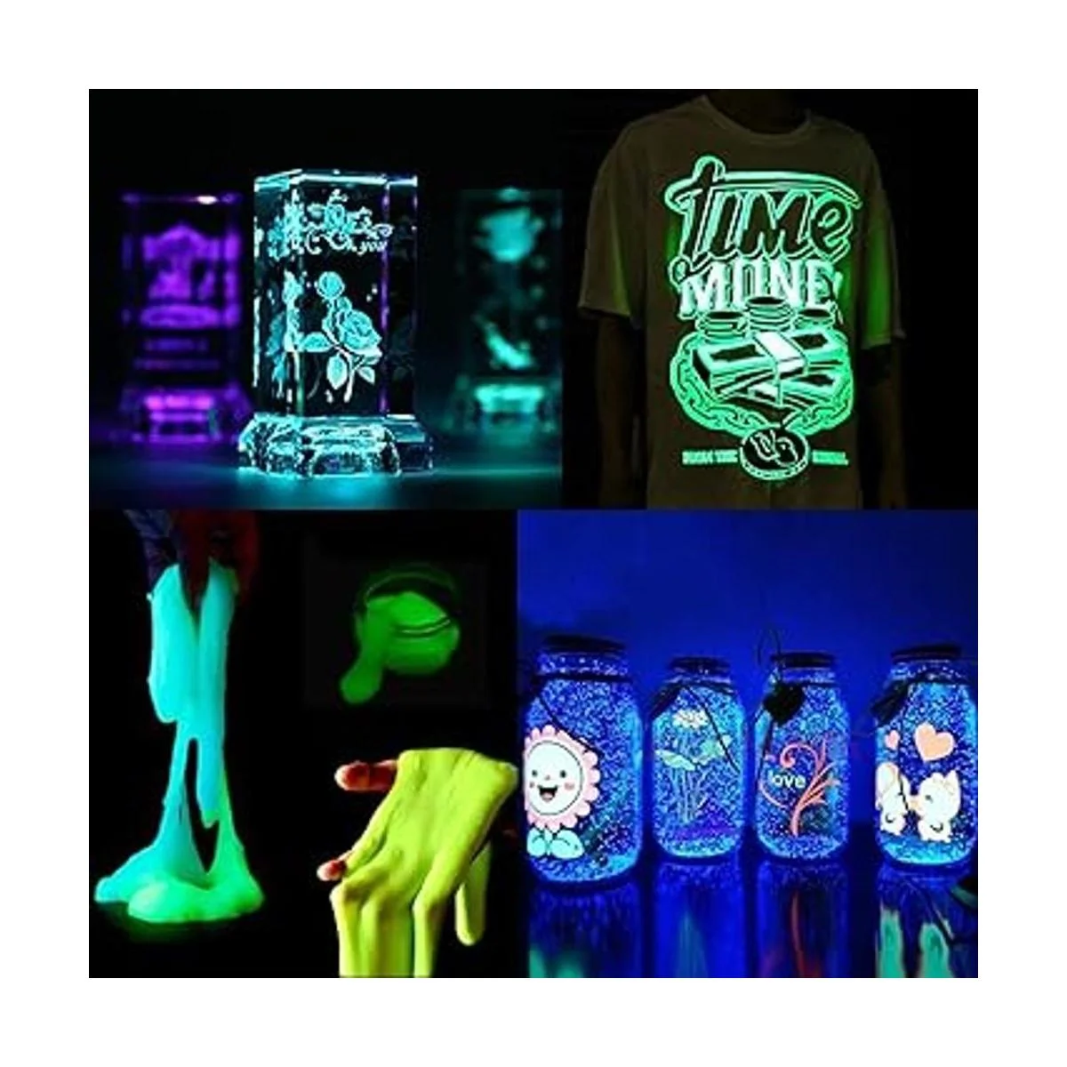 Fácil de usar: simplemente carga el pigmento que brilla en la oscuridad bajo la luz solar o cualquier fuente de luz directa. Para una carga rápida e intensa, recomendamos encarecidamente la fuente de luz brillante y directa: tubos UV de luz negra o bombillas negras de bajo consumo. Entonces el polvo de pigmento brillará en la oscuridad.