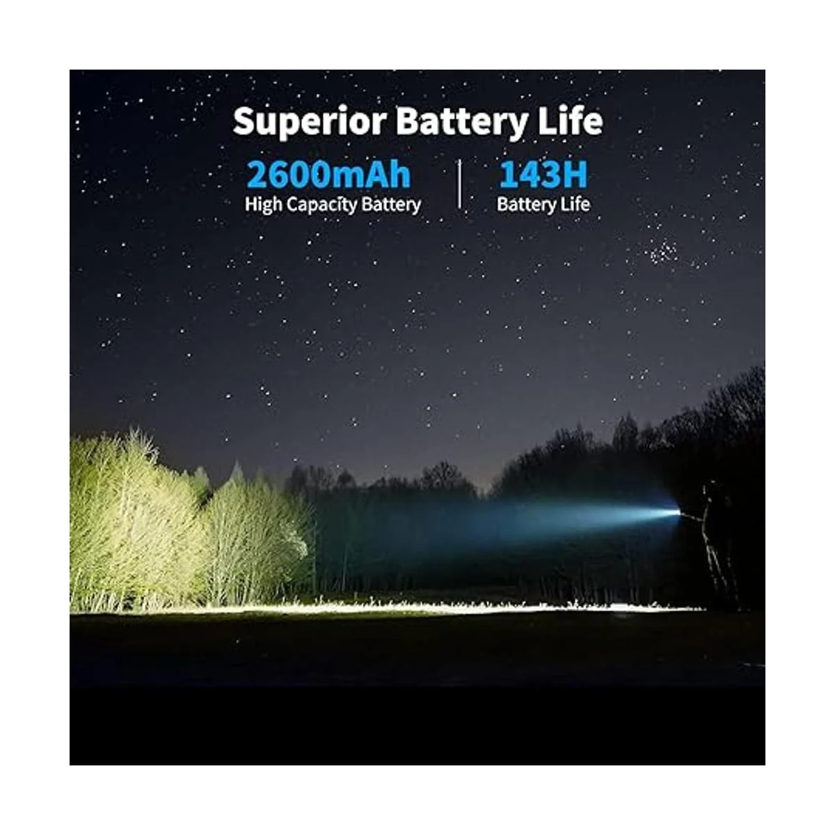 Hasta 143 horas de uso: esta linterna recargable viene con una potente batería interna de 2600 mAh. Soporta la linterna dura hasta 143 horas Eco con una sola carga. Siempre listo para soportar tu aventura al aire libre. Tiene un indicador de batería inteligente para que sepas cuándo la batería necesita ser cargada.