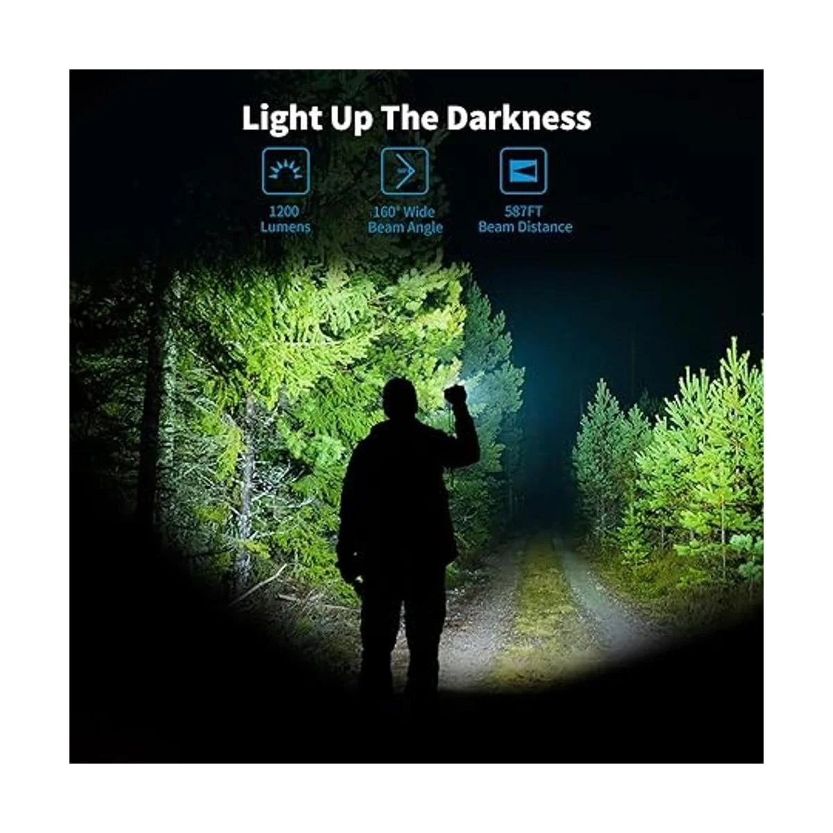 Haz ultra brillante de 1200 lúmenes: equipada con bombillas LED importadas alemanas, esta linterna puede apagar 1200 lúmenes de haz ultrabrillante. Ilumina fácilmente objetos a 587 pies. Con ángulo de haz amplio de 160, esta linterna recargable puede iluminar fácilmente la oscuridad. Adecuado para camping, senderismo, pasear al perro o EDC.
