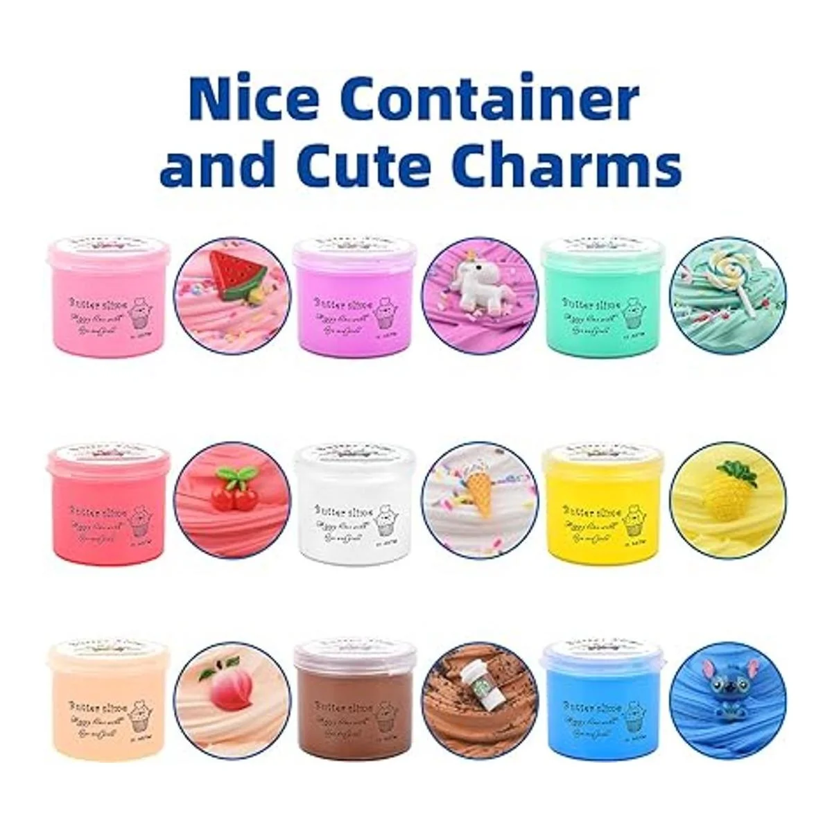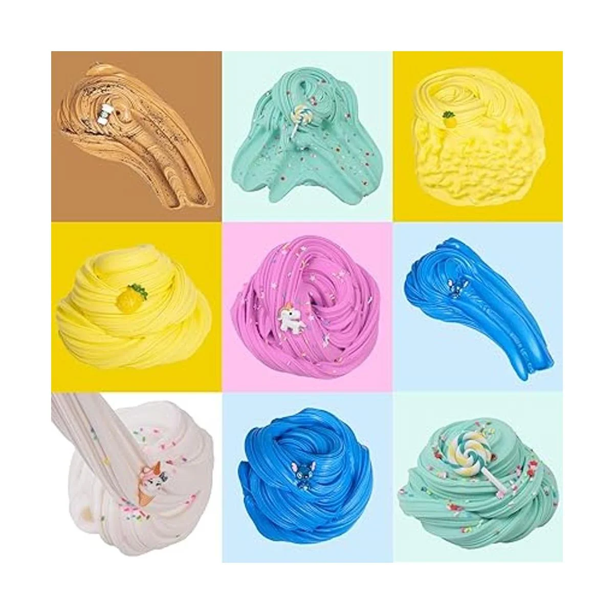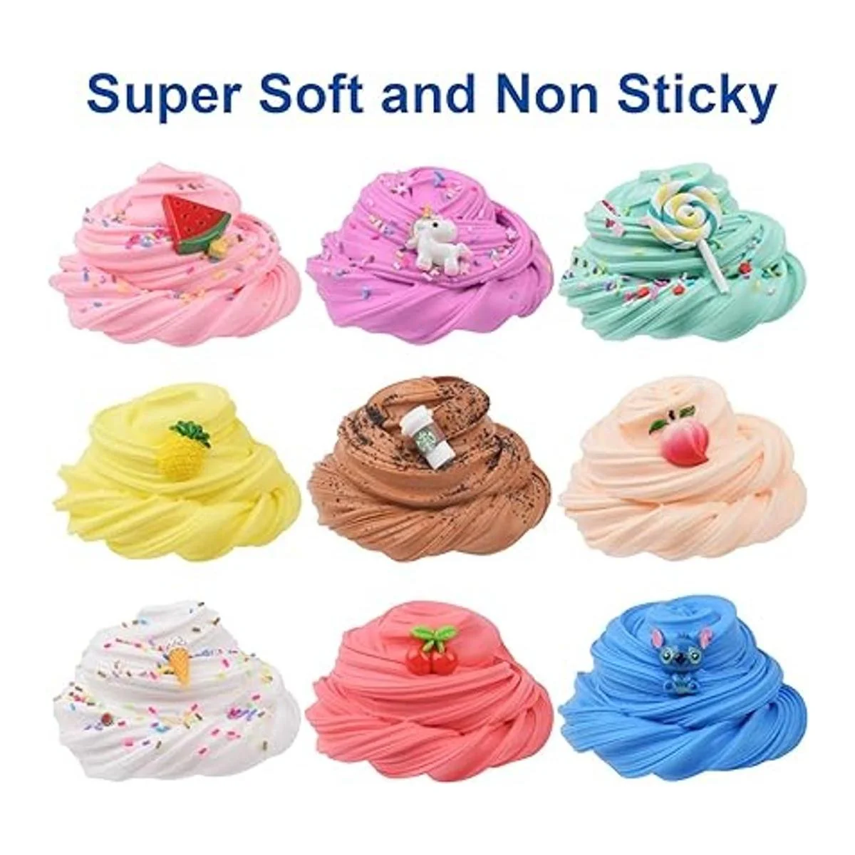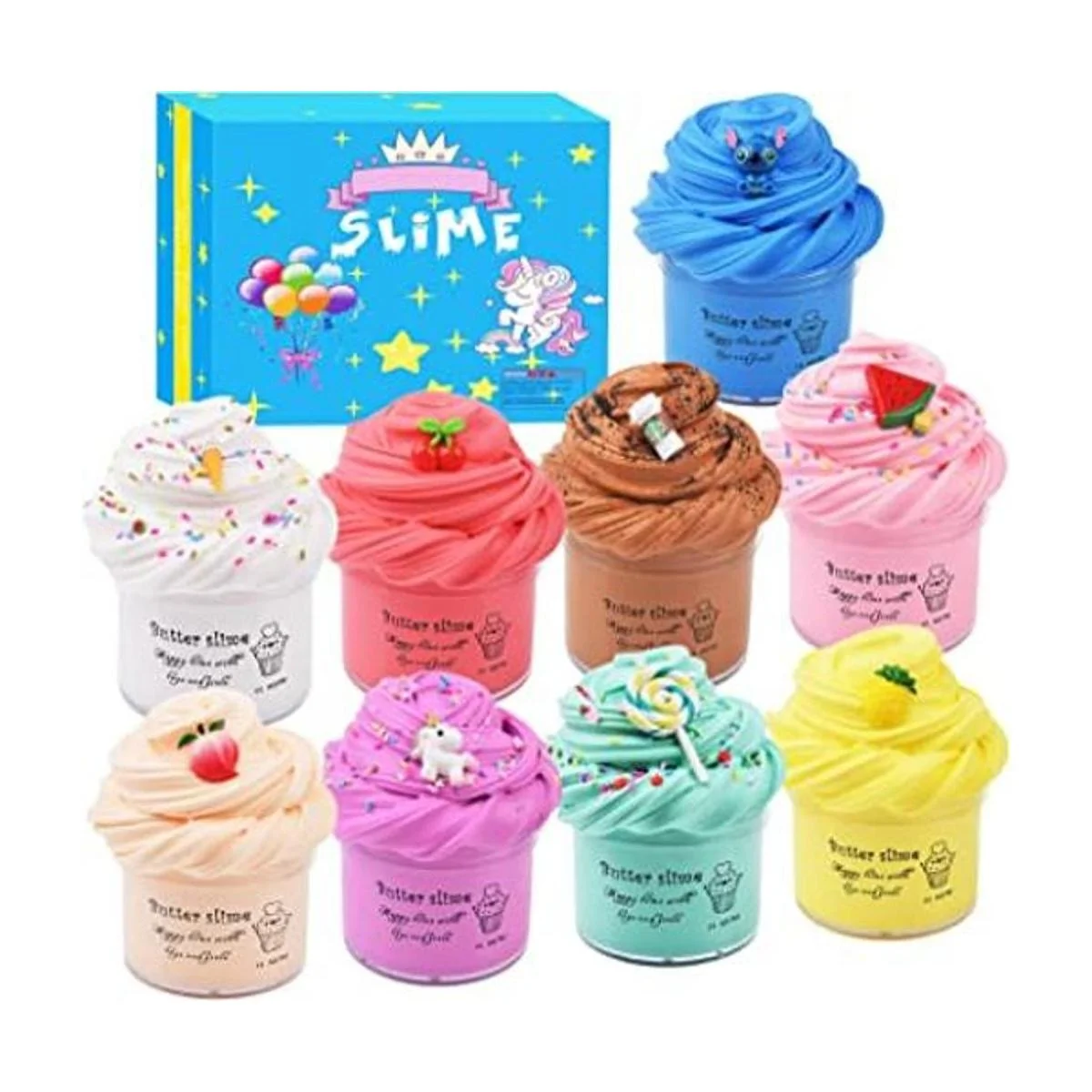 WUHUANIU Paquete de 9 unidades de limo de mantequilla perfumada, limo ideal para niños, súper suave y no pegajoso, juguete sorpresa de limo de bricolaje, con dije de unicornio, cereza, helado, puntadas, sandía, latte y más