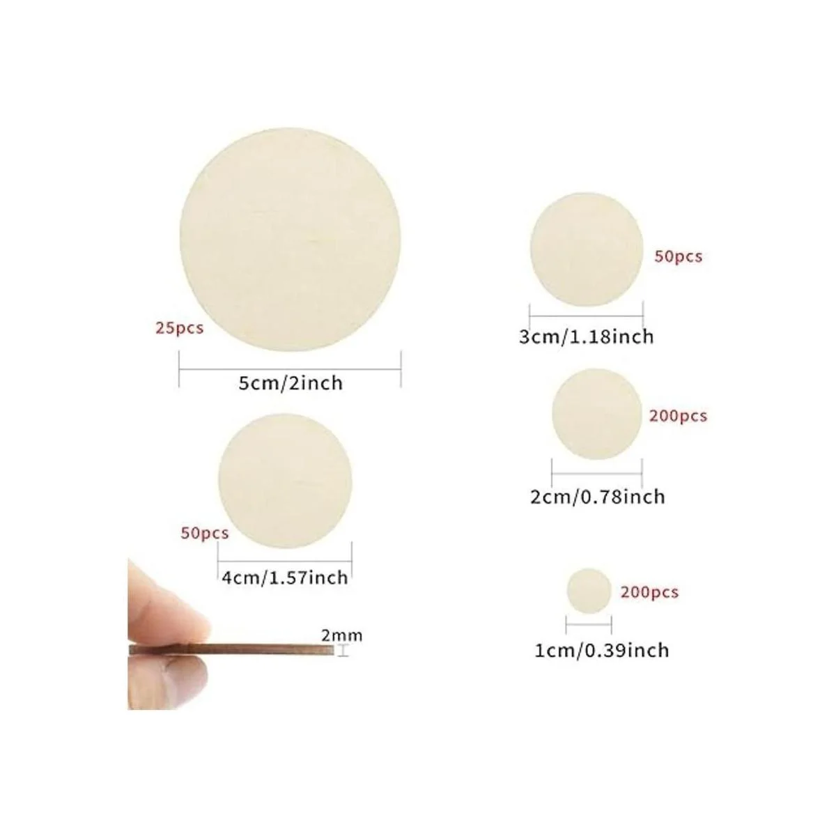 Varios tamaños: proporcionamos 5 tamaños diferentes de piezas redondas de madera sin acabar, es decir, 1.969 in 25 piezas, 1.575 in 50 piezas, 1.181 in 50 piezas, 0.787 in 200 piezas y 0.394 in 200 piezas.