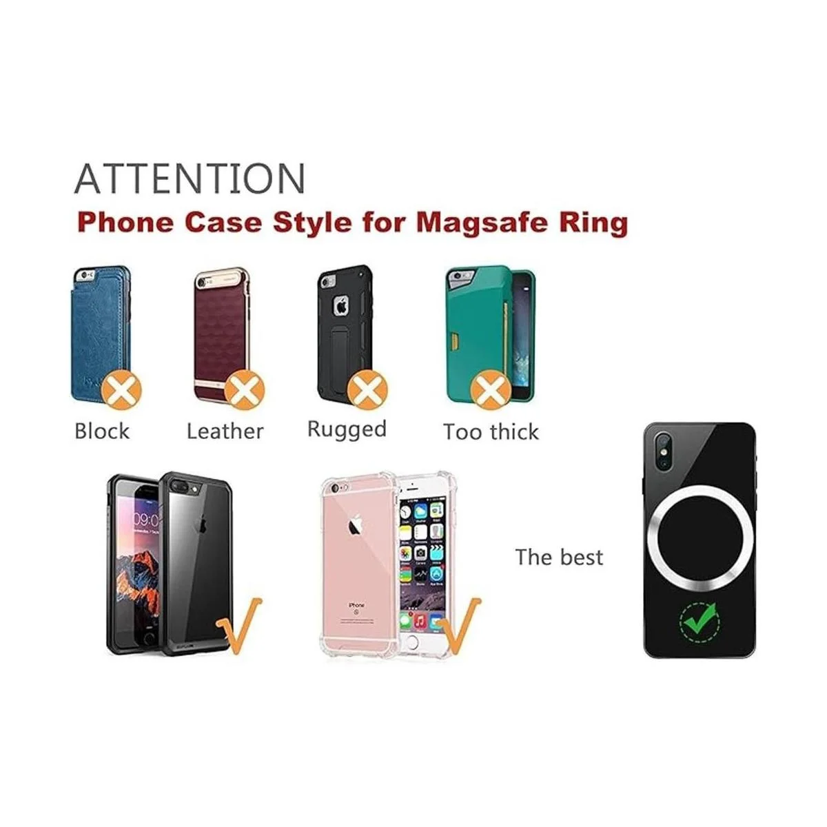 Este anillo de metal no es magnético, compatible con cargador Magsafe, hace que tu funda estándar sea compatible con MagSafe para una carga inalámbrica magnética rápida y fácil