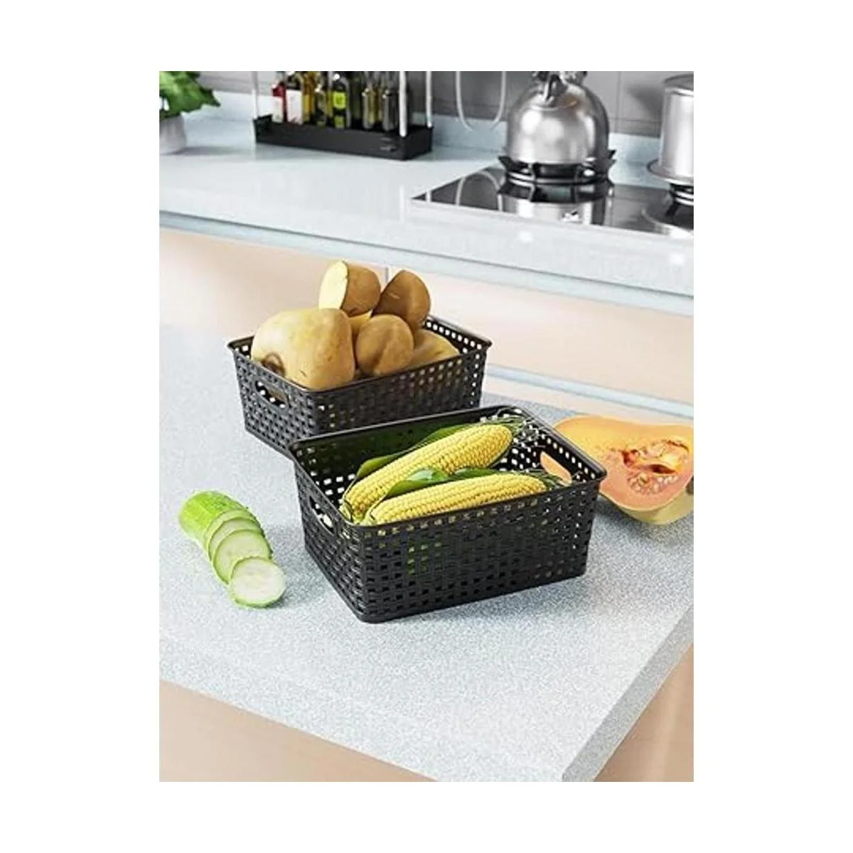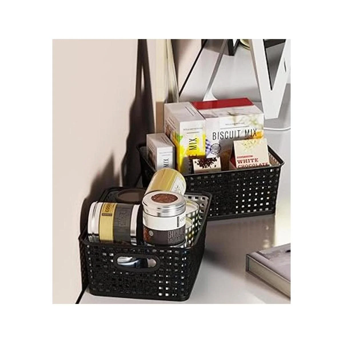 Para una cómoda cesta de almacenamiento que está construida con la robustez para darte años de servicio. El cuerpo de plástico translúcido duradero con diseño de mimbre está diseñado para durar con materiales de alta calidad