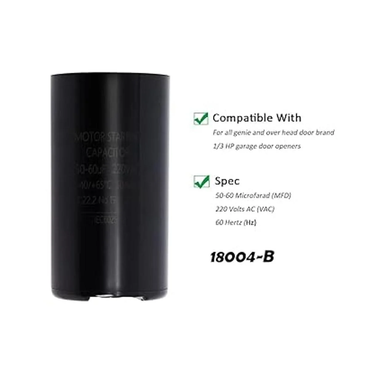 X18004b Condensador, 5060 MFD 220 VCA 60HZ de repuesto compatible con Genie 18004B Condensador de arranque del motor de apertura de puerta de garaje