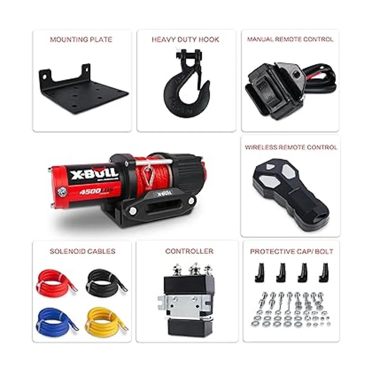 XBULL Kit de cabrestante eléctrico de 12 V de 4500 libras con cabrestante de cuerda sintética impermeable con control remoto inalámbrico y soporte de montaje