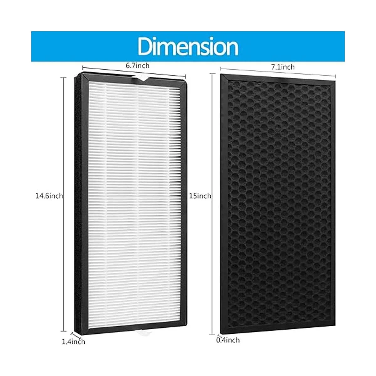 Especificaciones: Dimensiones del producto: filtro HEPA: 14.6 x 6.7 x 1.4 pulgadas, filtro de carbón L: 15.0 x A: 7.1 x Alto: 0.4 pulgadas. El paquete incluye 1 filtro de carbono y 1 filtro HEPA. Se recomienda reemplazar el filtro en promedio de 12 meses o dependiendo del uso.