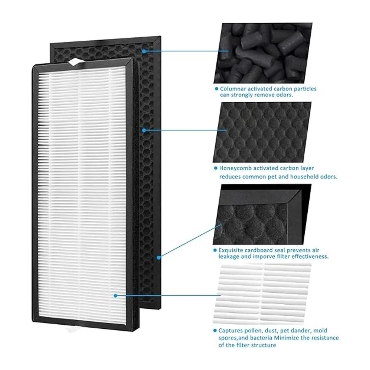 Filtro de carbono activado: las partículas de carbón activado columnar de alta calidad tienen una increíble potencia de reducción de olor, pueden eliminar fuertemente olores no deseados, humo y niebla, PM 2.5, toxinas nocivas, compuestos orgánicos volátiles, humos de pintura, contaminantes químicos y más. La capa de carbono de panal puede contener más partículas de carbono y absorber eficazmente los olores comunes de mascotas y del hogar. Exquisito sello de cartón que evita fugas de aire y eficacia de importación.