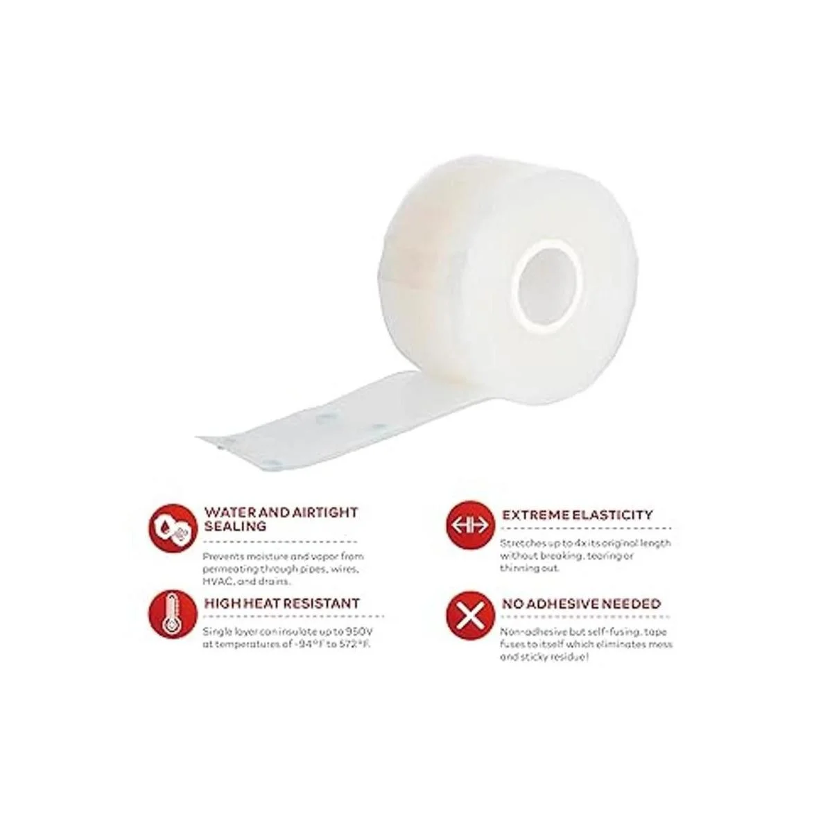 Ideal para reparaciones rápidas de emergencia. Nuestra cinta de silicona transparente autofusible PRO está hecha de 100 silicona que se envuelve alrededor de sí misma sin la necesidad de ningún adhesivo, proporcionando un sellado hermético instantáneo e impermeable a mangueras con fugas, tuberías, cableado eléctrico, coaxial al aire libre, arneses de cableado y otros accesorios y conexiones. Esta cinta elástica y sellada es imprescindible para fontanería, reparación de fugas y kits de reparación de automóviles o barcos.
