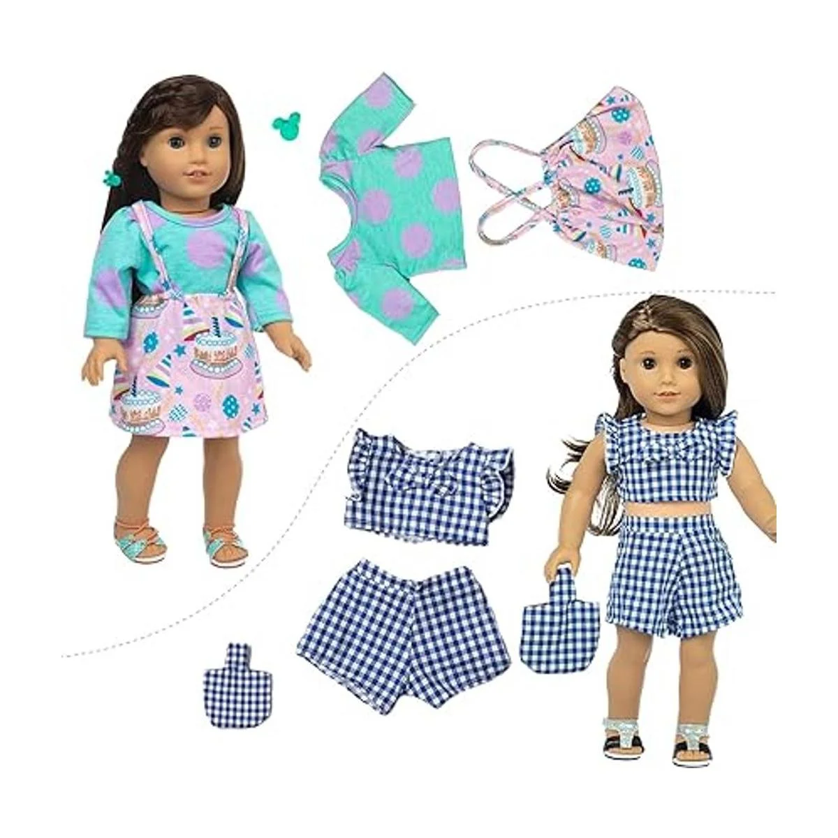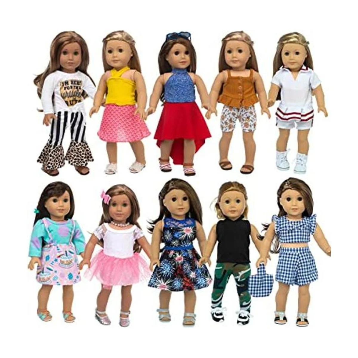 XFEYUE 22 piezas de ropa de muñeca de 18 pulgadas, regalos y accesorios, se adapta a muñecas estadounidenses de 18 pulgadas, incluye 10 juegos de ropa de muñeca de varios estilos, pinzas para el cabello y bolsos de gafas de sol