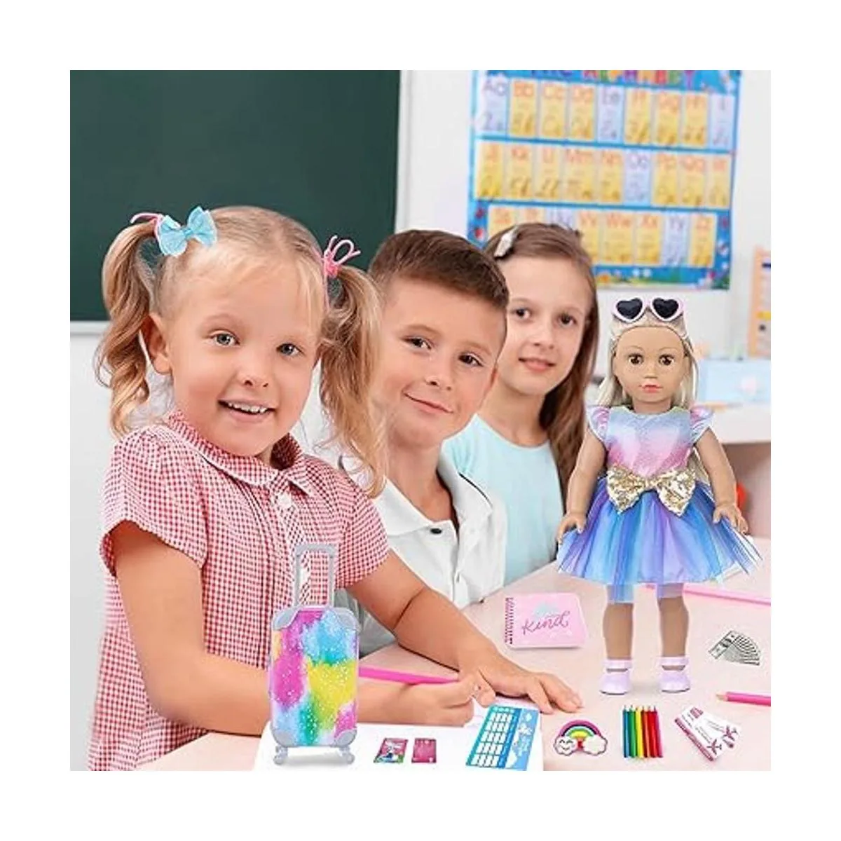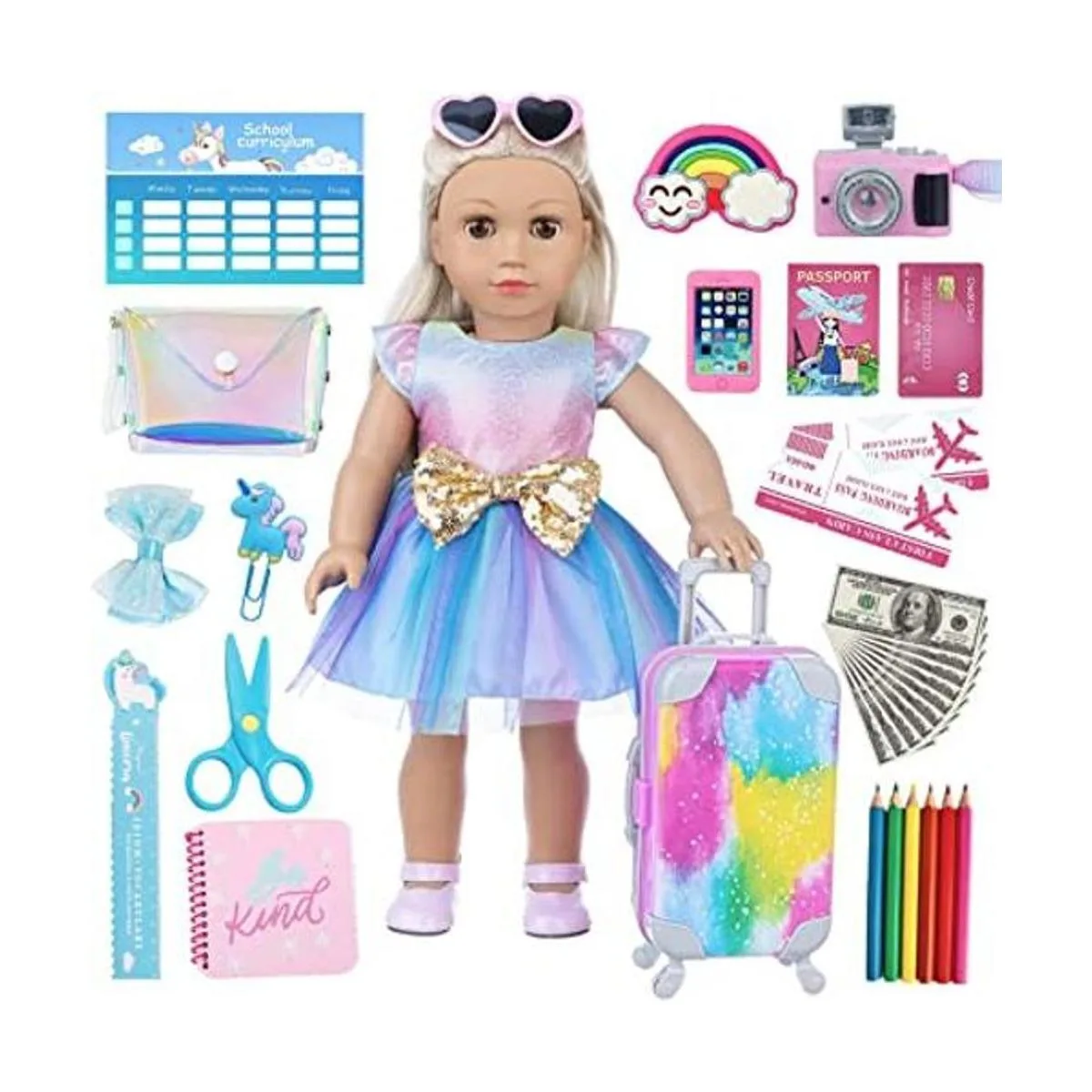 Contenido del paquete: ropa adecuada para muñecas de 18 pulgadas. Incluye 32 accesorios de muñeca americana: 1 maleta de viaje, 1 juego de suministros escolares, 1 bolso, 1 cámara, 1 teléfono, 2 horquillas, 1 tarjeta bancaria, 1 pasaporte y 2 boletos. Muñecas y zapatos no incluidos