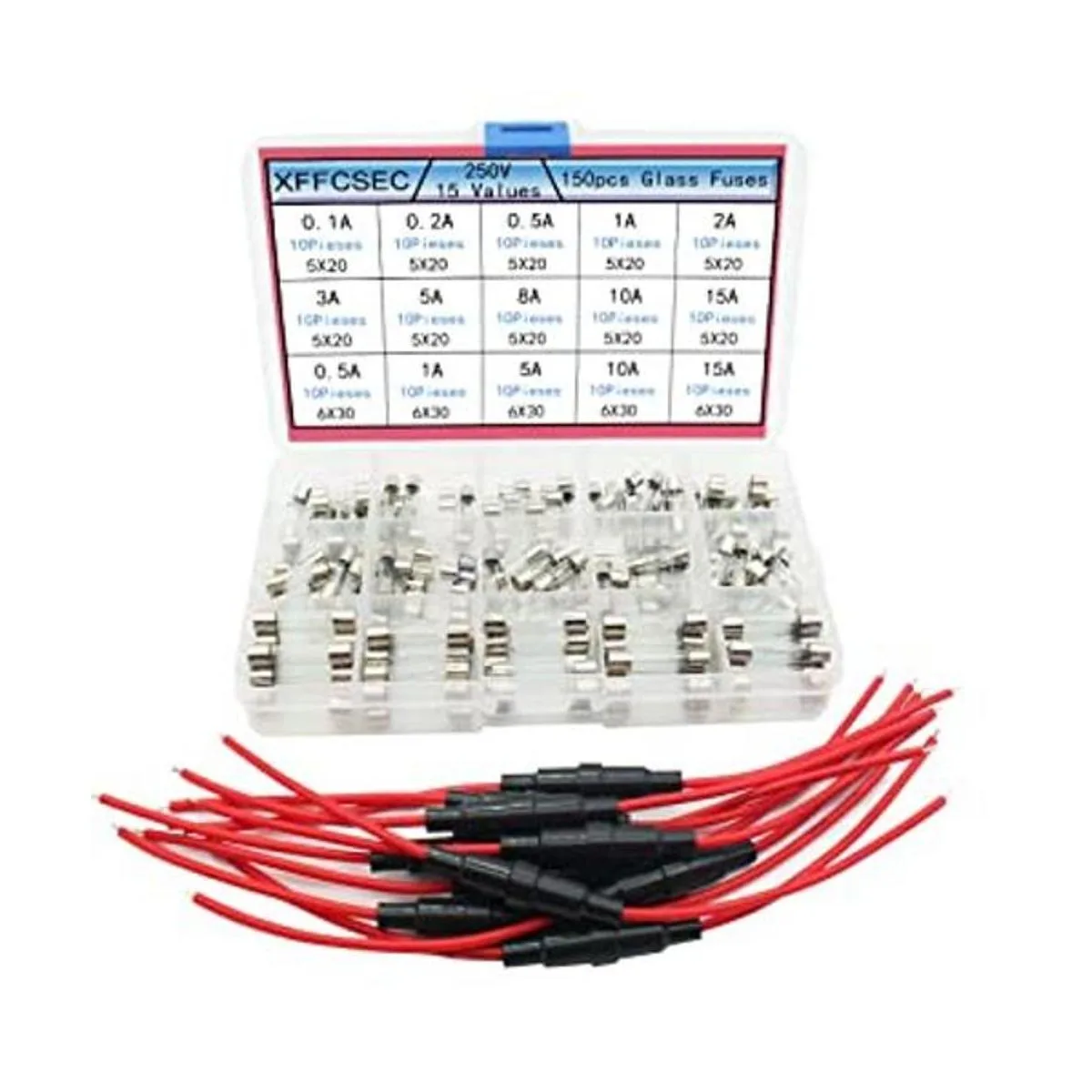 XFFCSEC 10 piezas de 0.197 x 0.787 in tipo de tornillo en línea con cable de 18 AWG 150 piezas de fusible de tubo de vidrio de soplado rápido, kit surtido de amperios de 250 V 0.1 A, 0.2 A, 0.5 A, 2A, 3 A, 5 A, 5 A, 10 A, 15 A, 0.236 x 1.181 in