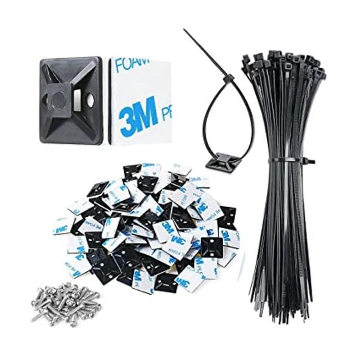XHF Soportes de sujeción de cable negro autoadhesivo de 34 pulgadas, 100 piezas con bridas de 8 pulgadas, tornillos, protección UV, sujetadores de alambre adhesivo para exteriores, clips de cables, anclajes de administración, soportes para organizadores, cuadrados