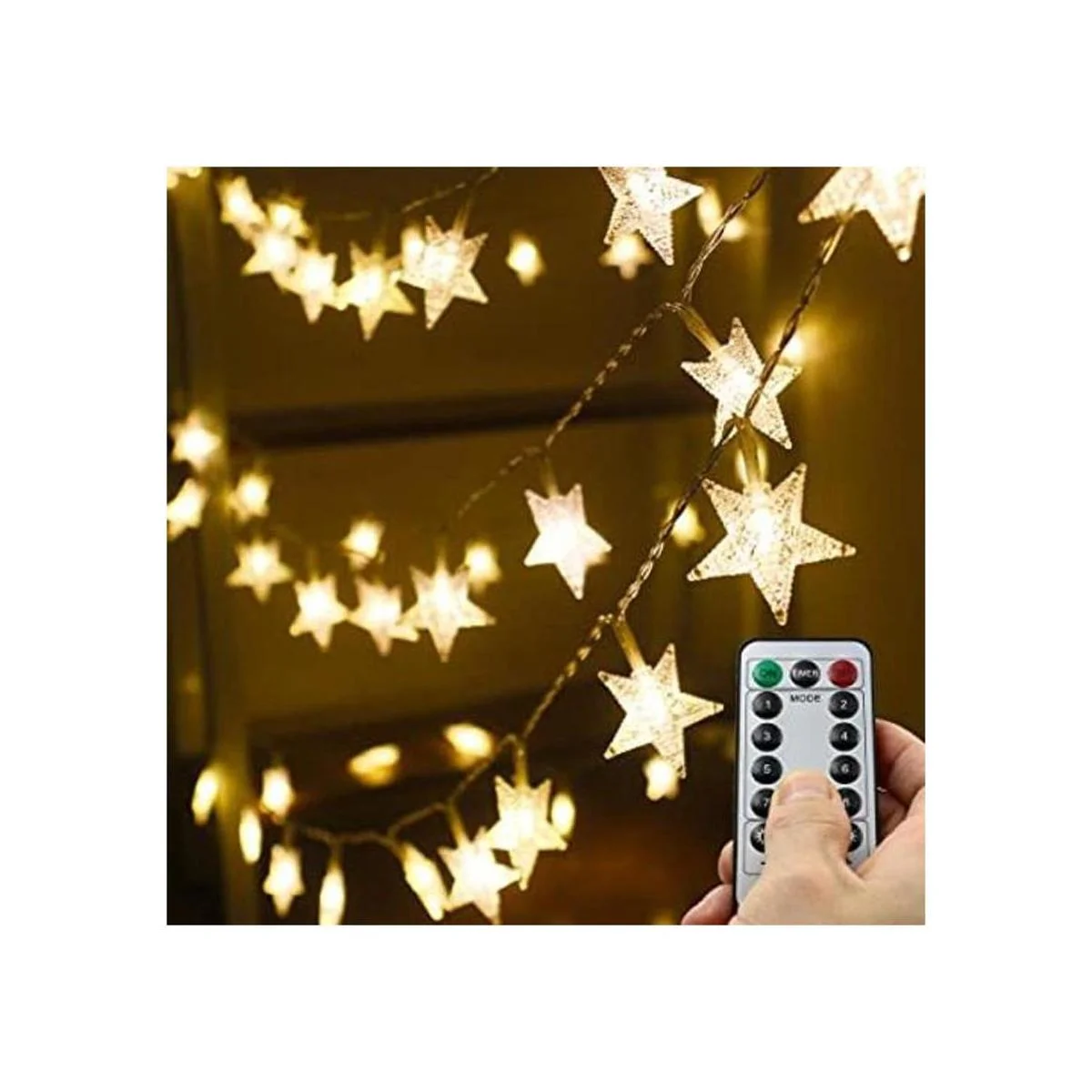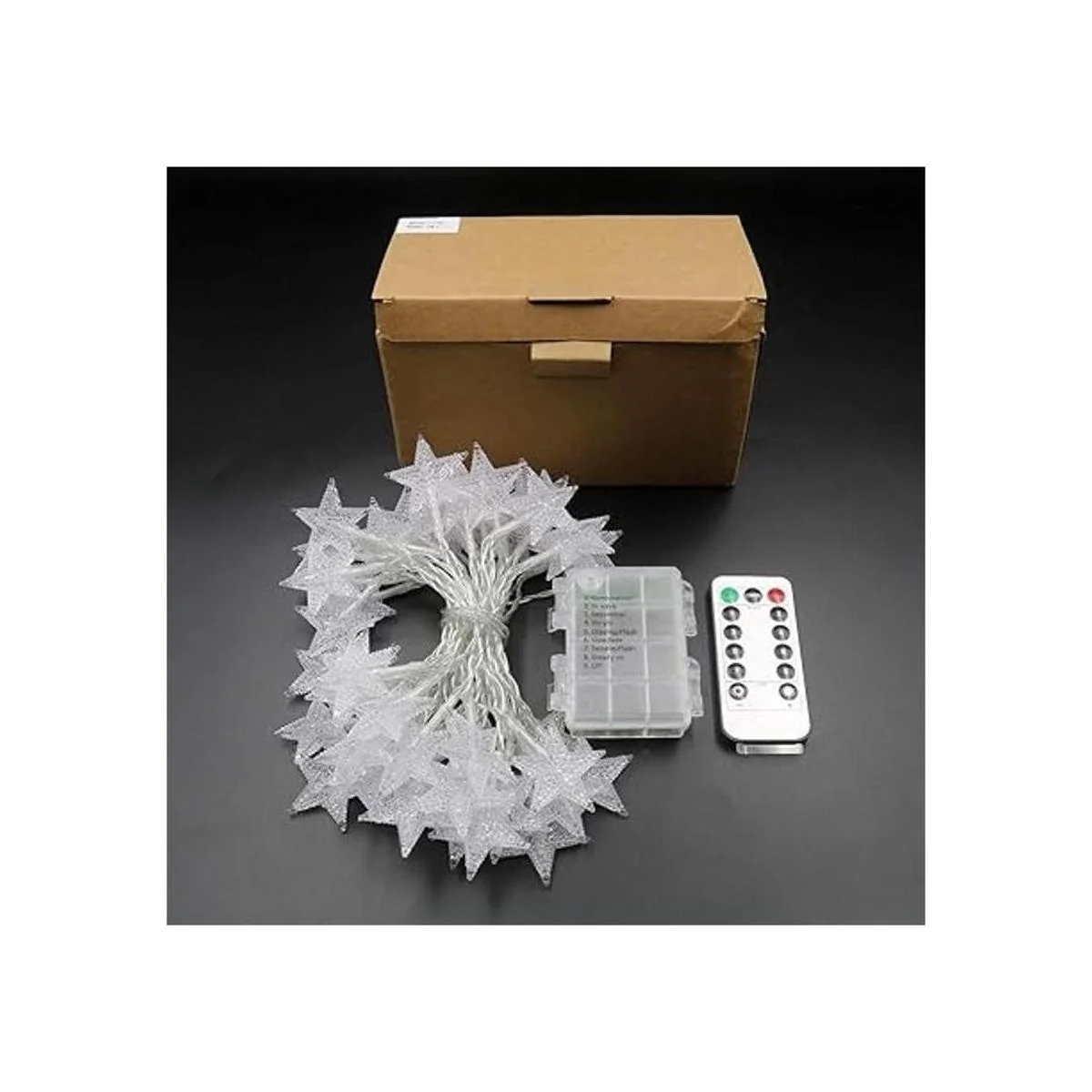 Xingpold Guirnalda de luces de estrella, 50 LED de 8 modos, funciona con pilas, con control remoto y temporizador, regulable, para dormitorio de niños, tienda de campaña, fiesta, boda, Navidad, decoración de color blanco cálido