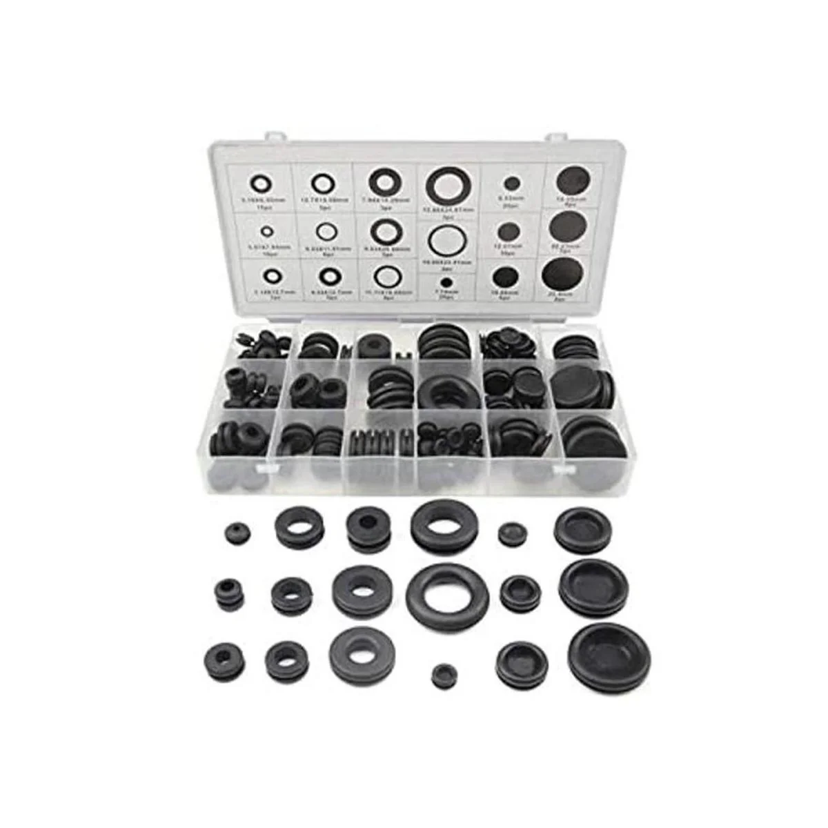 1. 125 ojales de goma de diferentes tamaños, empaquetados en una funda organizadora de plástico transparente con tapa de cierre a presión, portátil y fácil de almacenar, los ojales evitan el contacto de metal en metal para un paso seguro a través de conexiones en cortafuegos y conexiones.