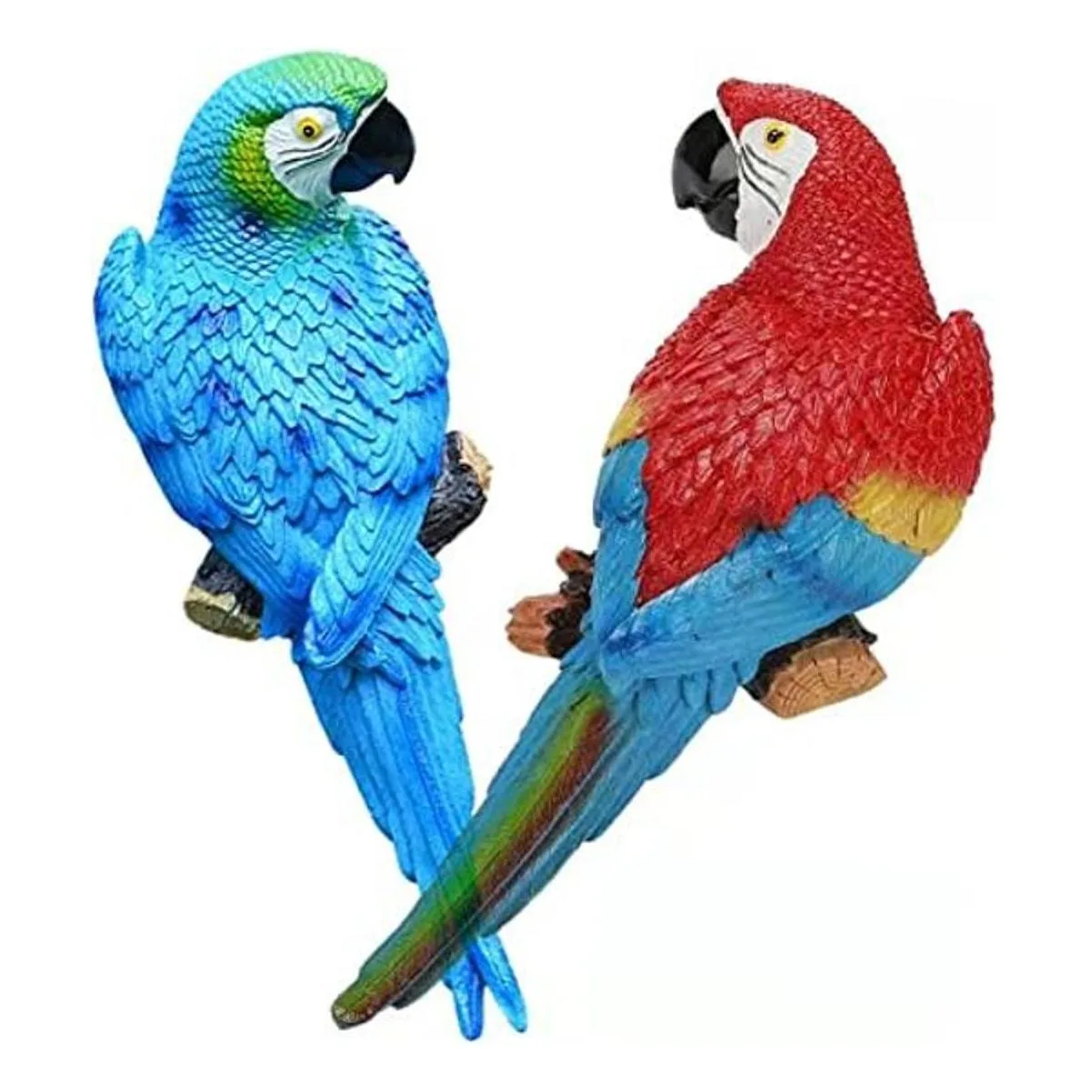 XKFLAUHM 1 par de estatuas de loros de resina realista, 12 pulgadas, brillante, escultura de loro de jardín, decoración de barra Tiki, adorno de paisaje, patio, patio, césped, árbol de pared, bricolaje azul y rojo