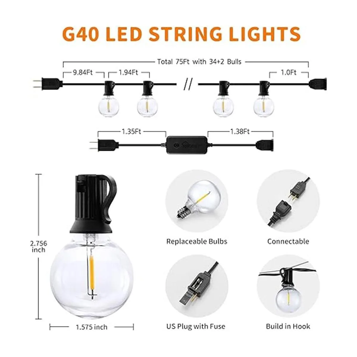Conectable y práctico reemplazable: 34 bombillas de globo de luces XMcosy para exteriores de 75 pies son reemplazables. Preparamos consideradamente 2 bombillas de repuesto dentro del paquete. Esta cadena de luces LED es capaz de extender varias cuerdas dentro de 1 controlador para satisfacer las necesidades de diferentes espacios.