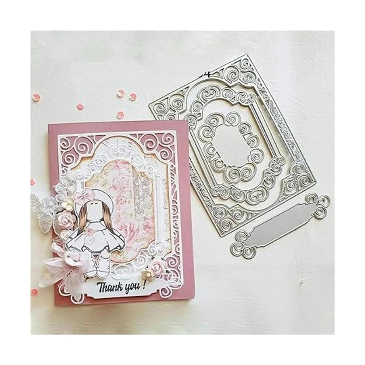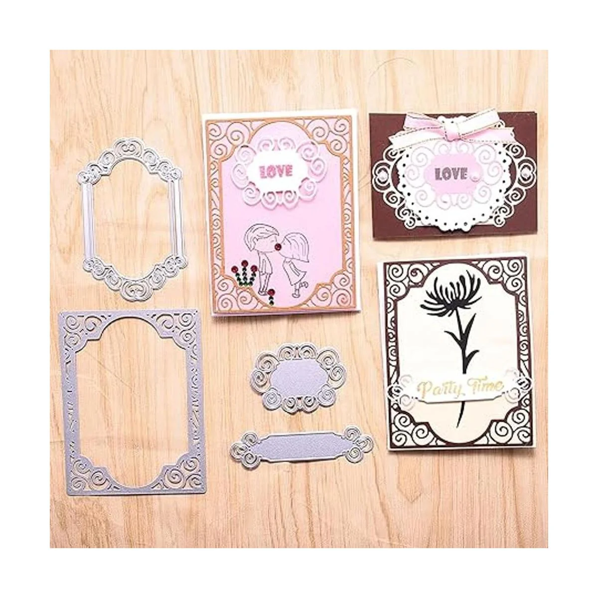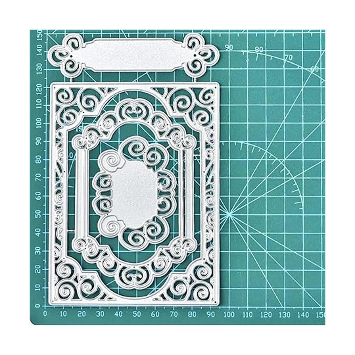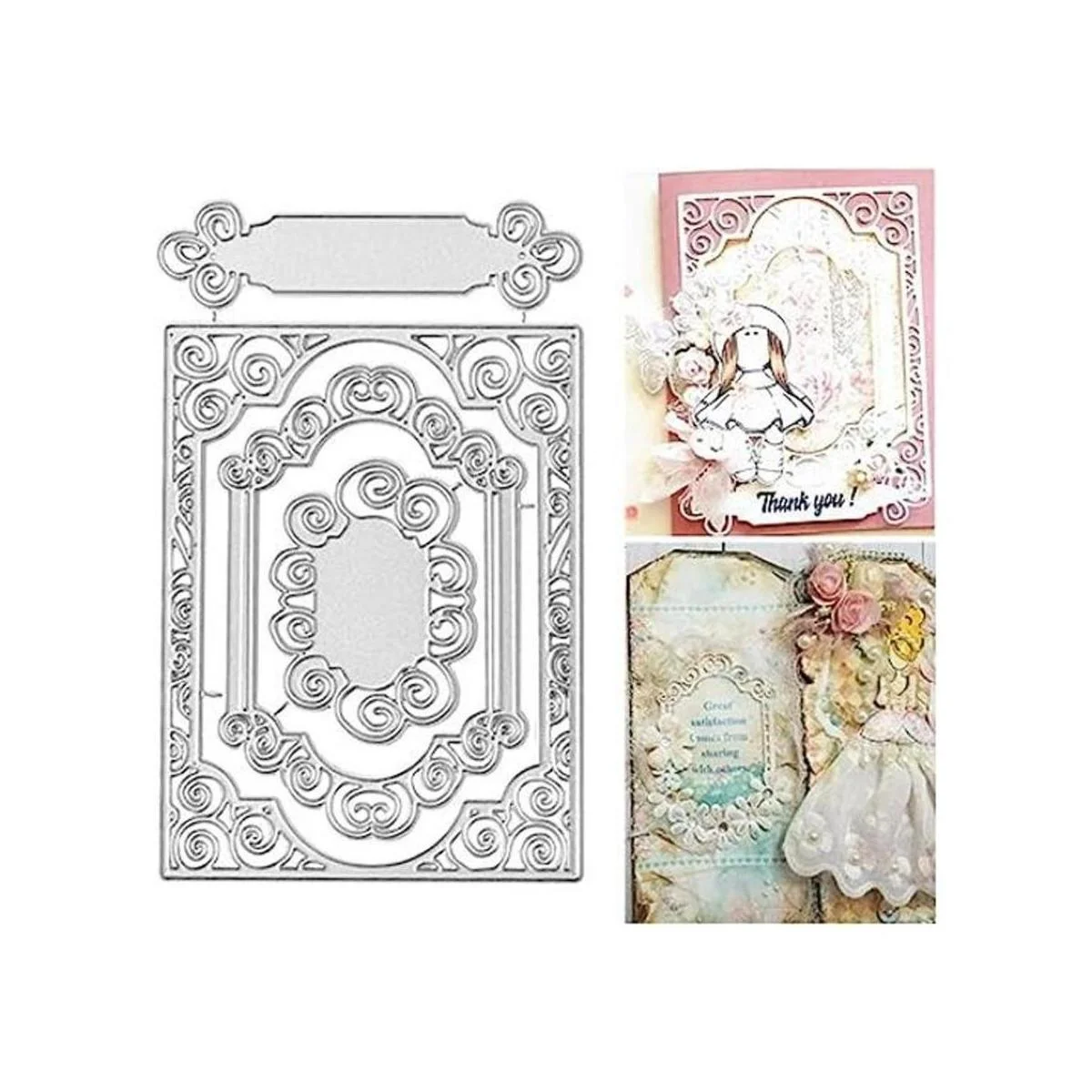 Color y tamaño: Color: plateado. Tamaño: 5.9 x 3.7 in. El paquete incluye: el juego de troqueles de corte contiene 4 plantillas de metal con patrón de marco de encaje.