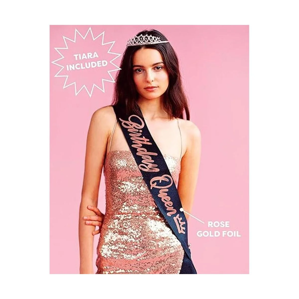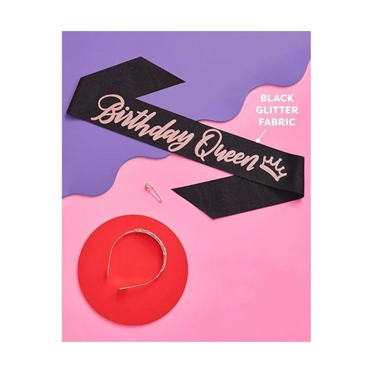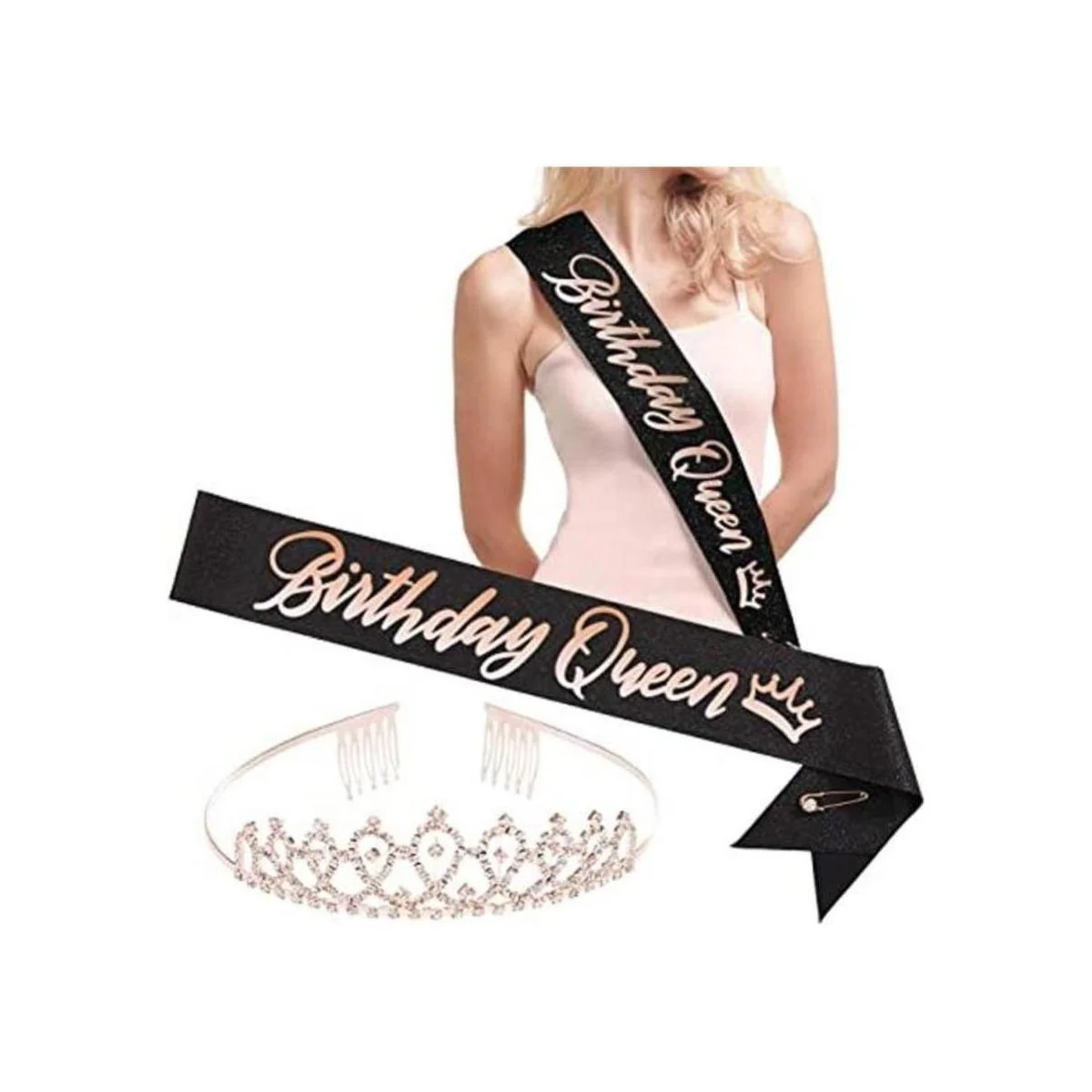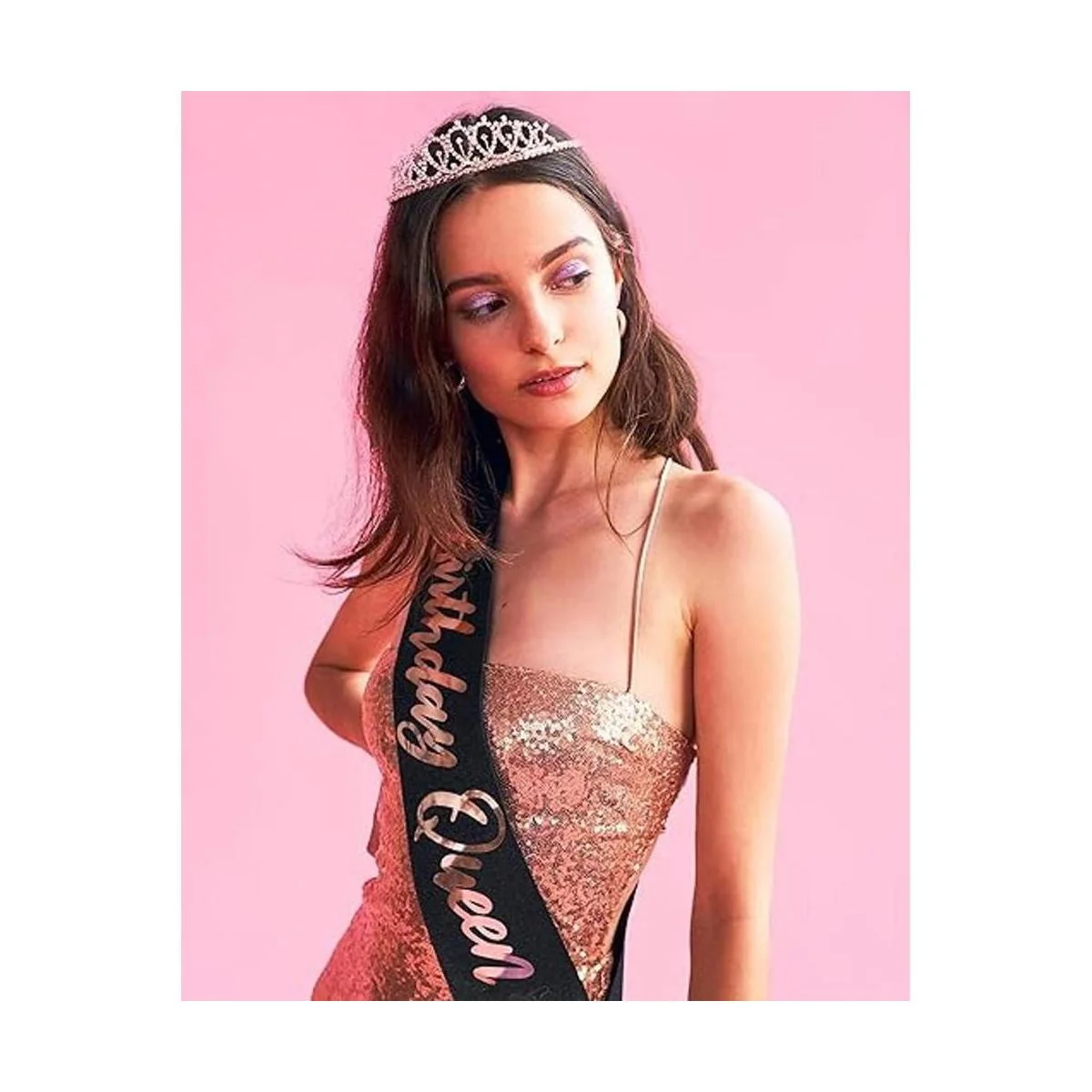 Purpurina negra lámina de oro rosa: nuestra banda está fabricada con el material de purpurina negra más hermoso lámina prensada a mano que dice Birthday Queen, cada banda mide 3.5 pulgadas de ancho y 33 pulgadas de largo.