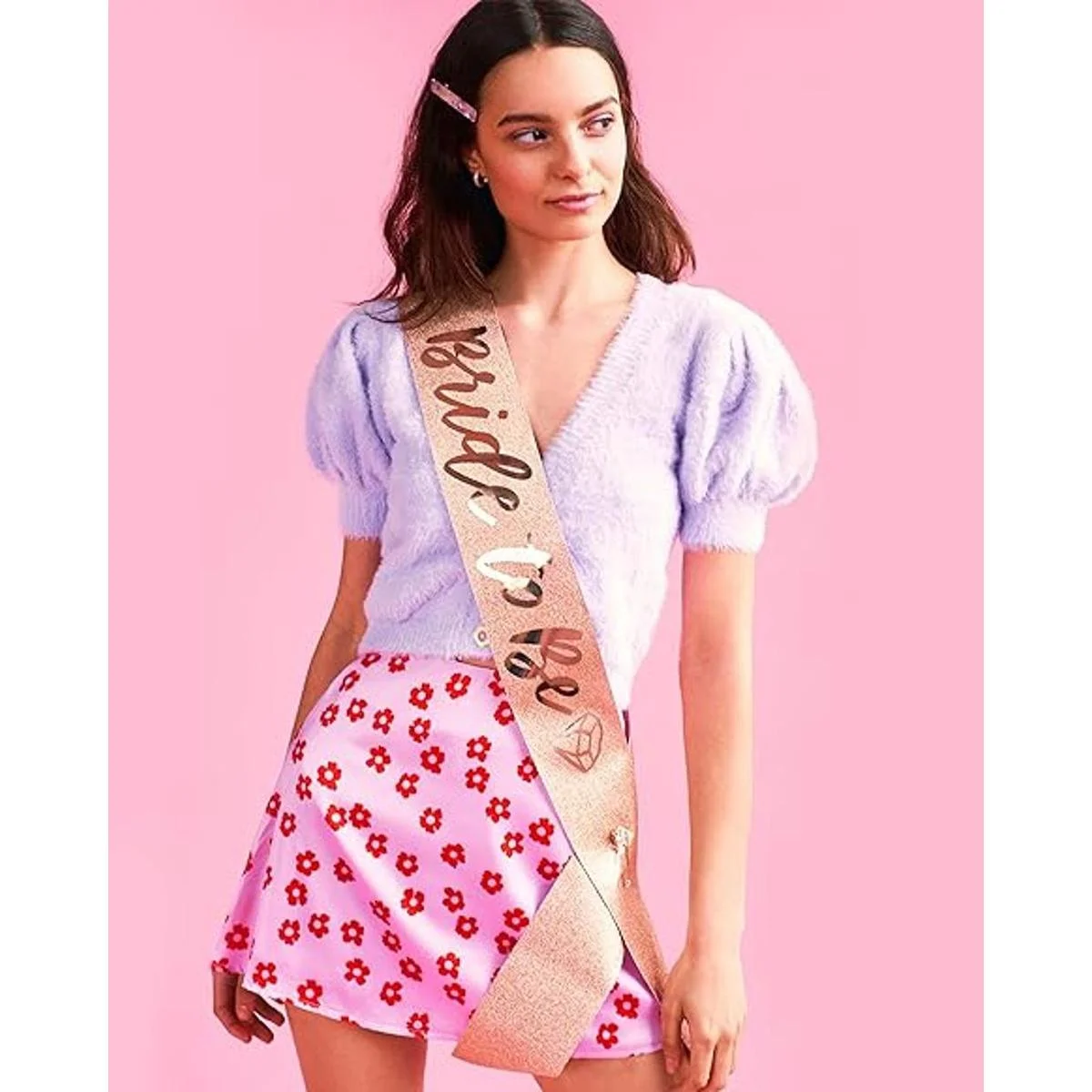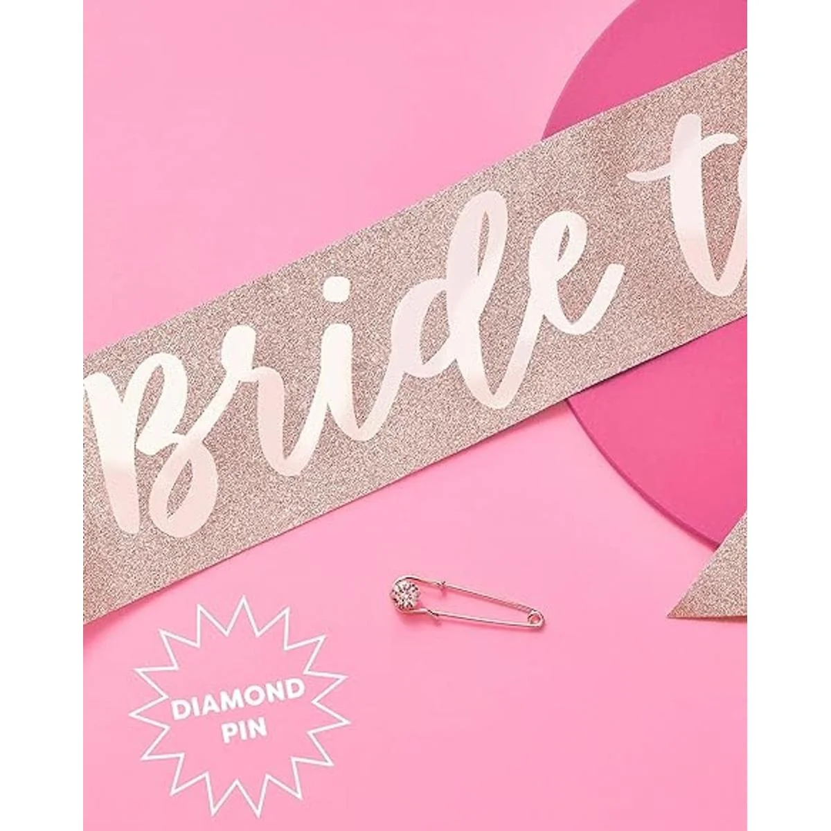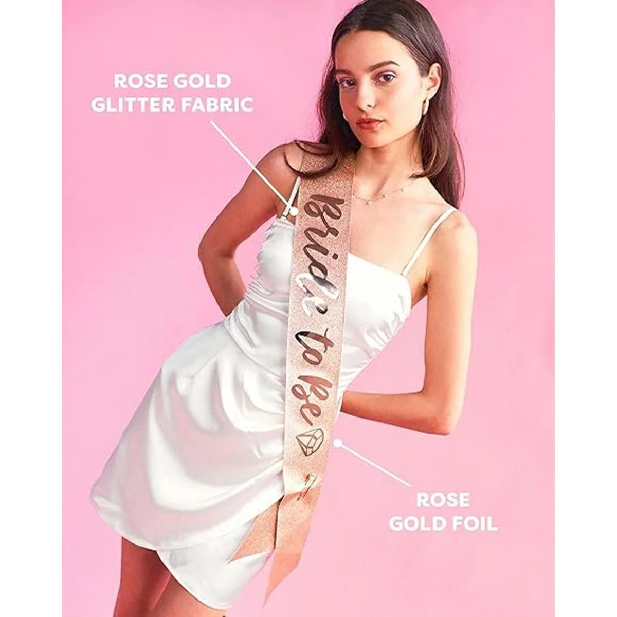 purpurina de oro rosa lámina: nuestra banda está fabricada con el material de purpurina de oro rosa más hermoso y lámina prensada a mano que dice bride to be, cada banda mide 3.5 pulgadas de ancho y 33 pulgadas de largo.