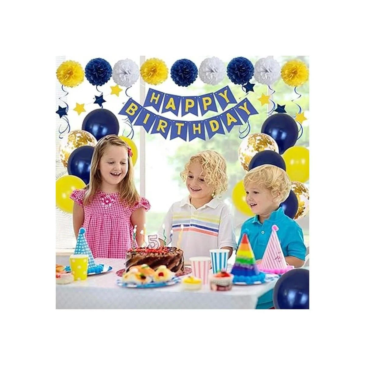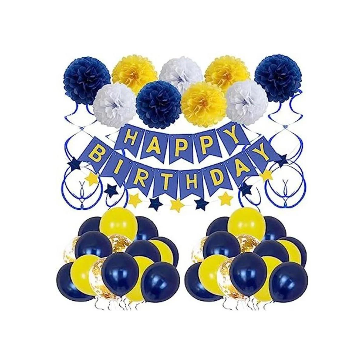 Todo en uno: viene con 1 juego de pancarta azul amarilla feliz cumpleaños, 1 cuerda de estrella azul amarilla, 6 remolinos colgantes azules amarillos, 9 pompones coloridos de papel de seda de 8 pulgadas 3 azules, 3 blancos, 3 amarillos, 30 globos de 12 pulgadas 16 azules, 8 amarillos, 6 confeti dorado, cinta de 32 pies.
