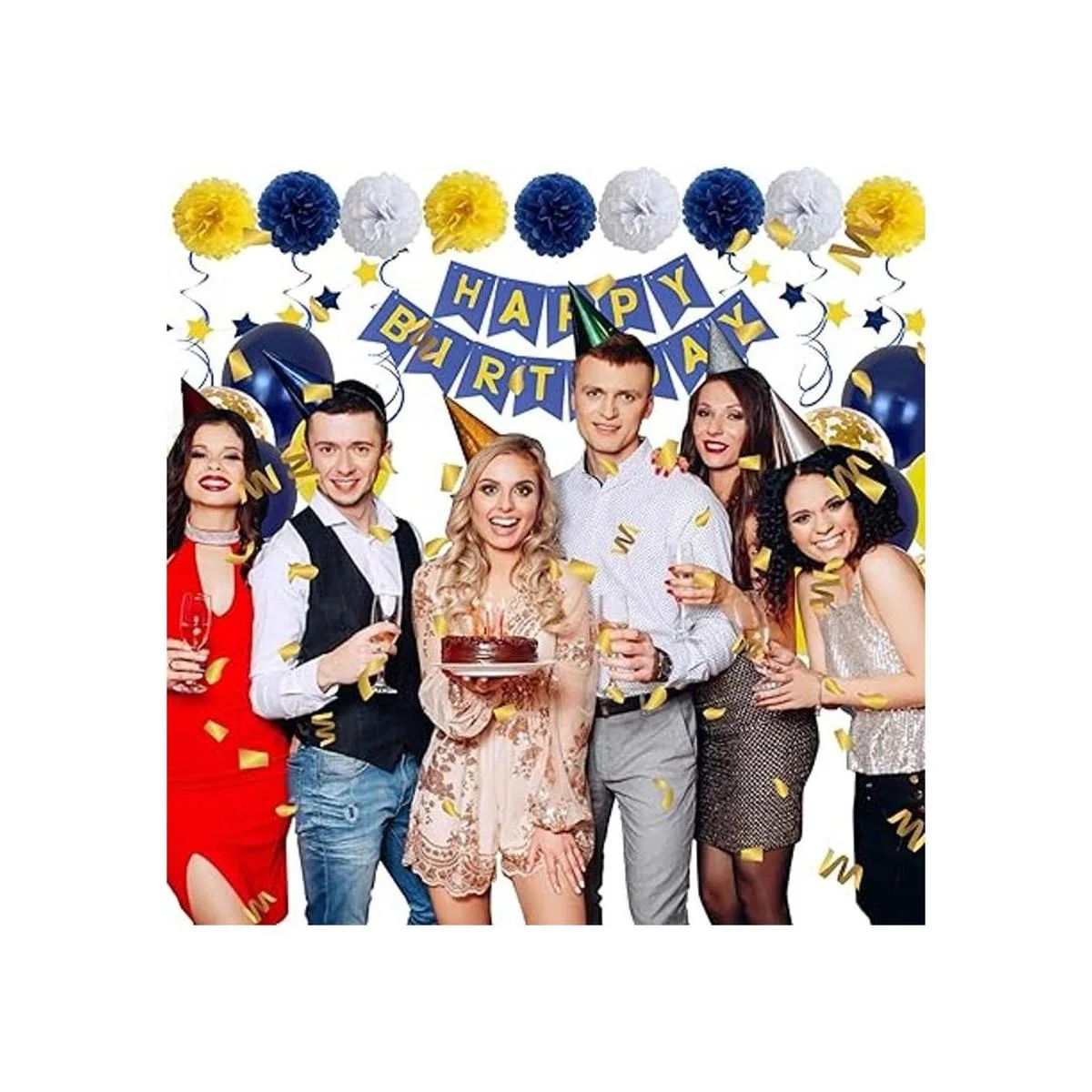 Xourspaty Decoraciones de cumpleaños, suministros de fiesta de feliz cumpleaños, banderines para hombres y mujeres, azul marino, amarillo, confeti, globos de látex, pompones de papel, remolinos colgantes 13, 16, 18, 21, 30, 40