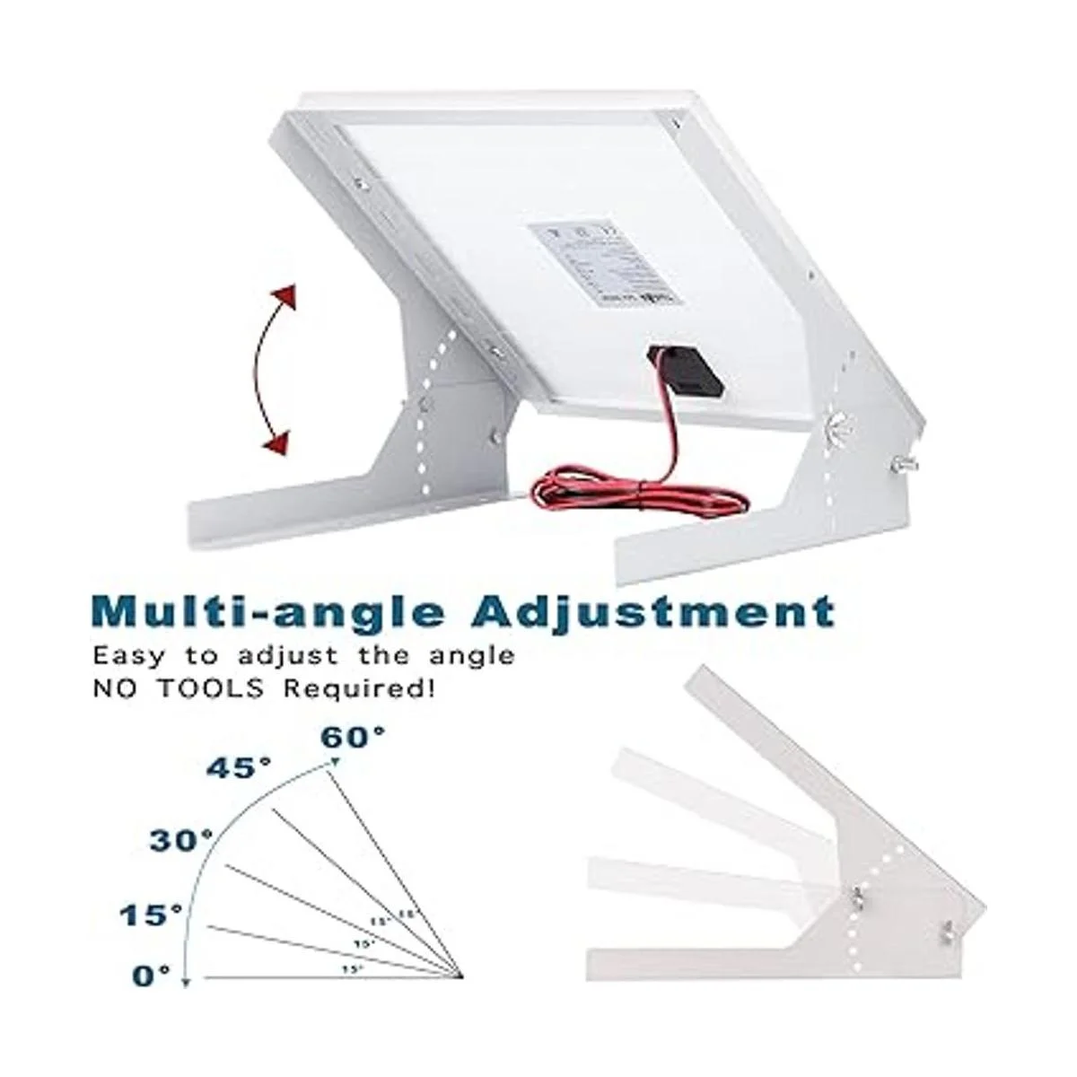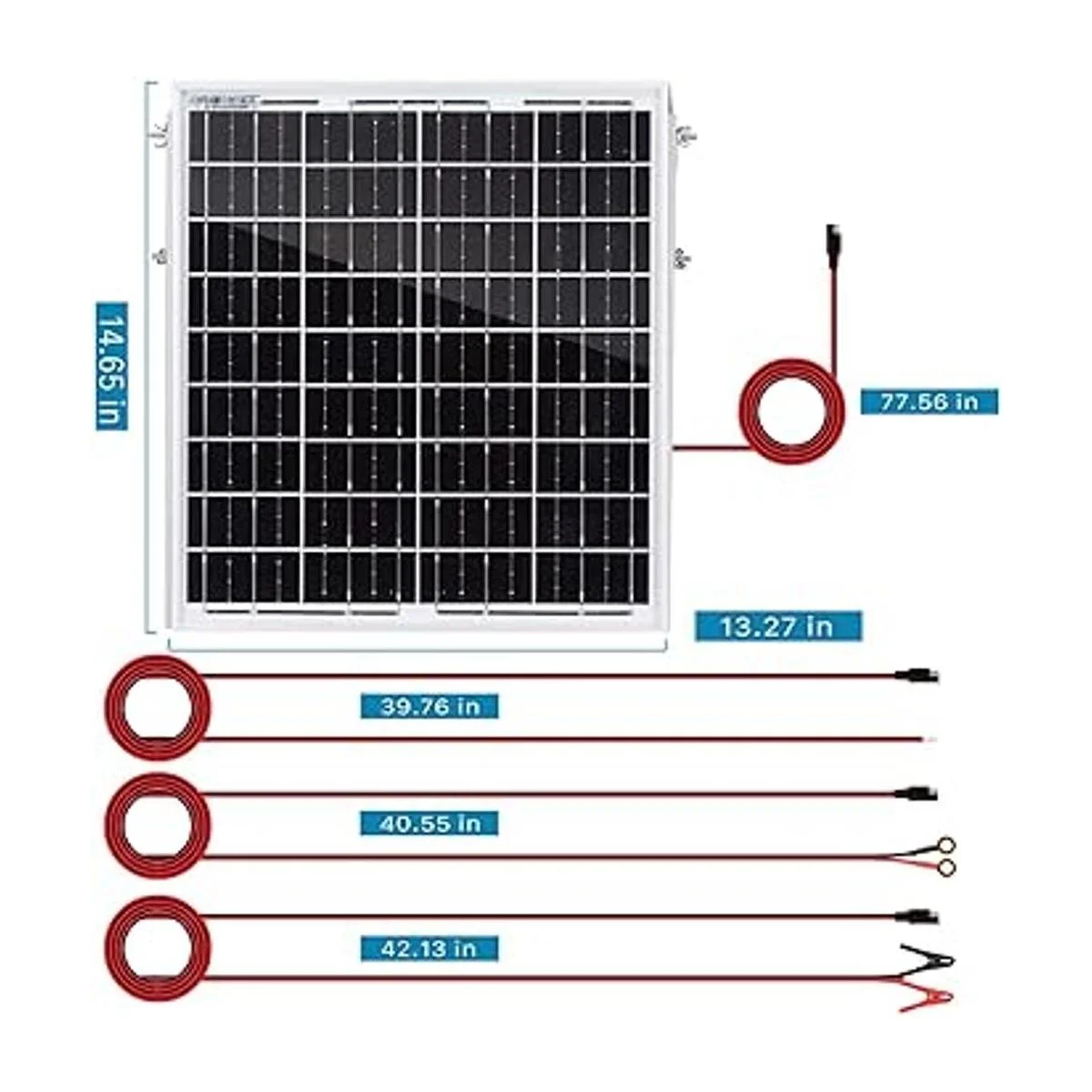 Los productos incluyen: panel solar de 14.65 x 13.27 pulgadas de 20 W, controlador de carga de 5 A 12 V/24 V, línea de clips de cocodrilo de 42.13 pulgadas, cable de extensión de 40.55 pulgadas con junta tórica, cable de extensión de 39.76 pulgadas, 1 juego de paneles solares ajustables para inclinar soportes de montaje.