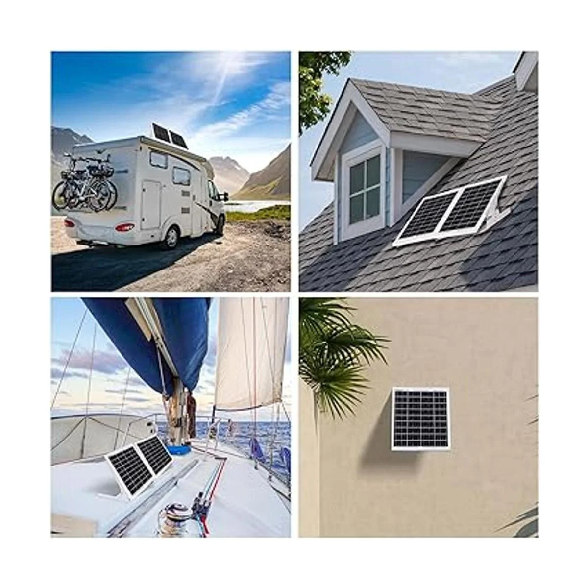 Adecuado para batería de 12 V. El panel solar de 12 voltios es un kit de energía solar ideal para un sistema de carga de batería de 12 voltios y varias aplicaciones de 12 V CC. Se aplica a RV, barco, techo, tierra, autocaravana, garajes, vallas, cámaras de seguridad, invernadero y otras superficies planas.