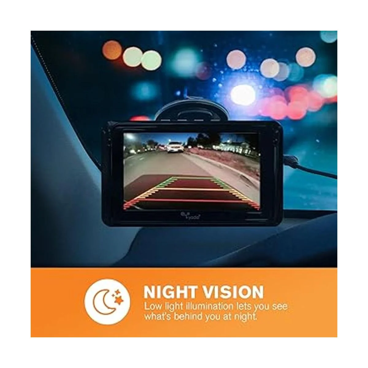 Pantalla manos libres de 5 pulgadas: mantén tus manos en el volante en todo momento; el monitor LCD de 5 pulgadas comienza a mostrar automáticamente la imagen de visión trasera en tiempo real cuando tu vehículo se pone en marcha atrás. Cuando no estás en modo inverso, la cámara de respaldo YADA y el monitor de pantalla cambiarán al modo de espera para reservar electricidad.