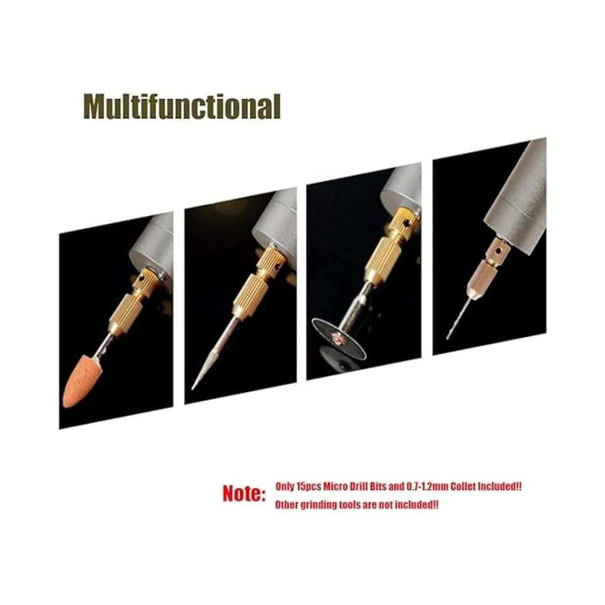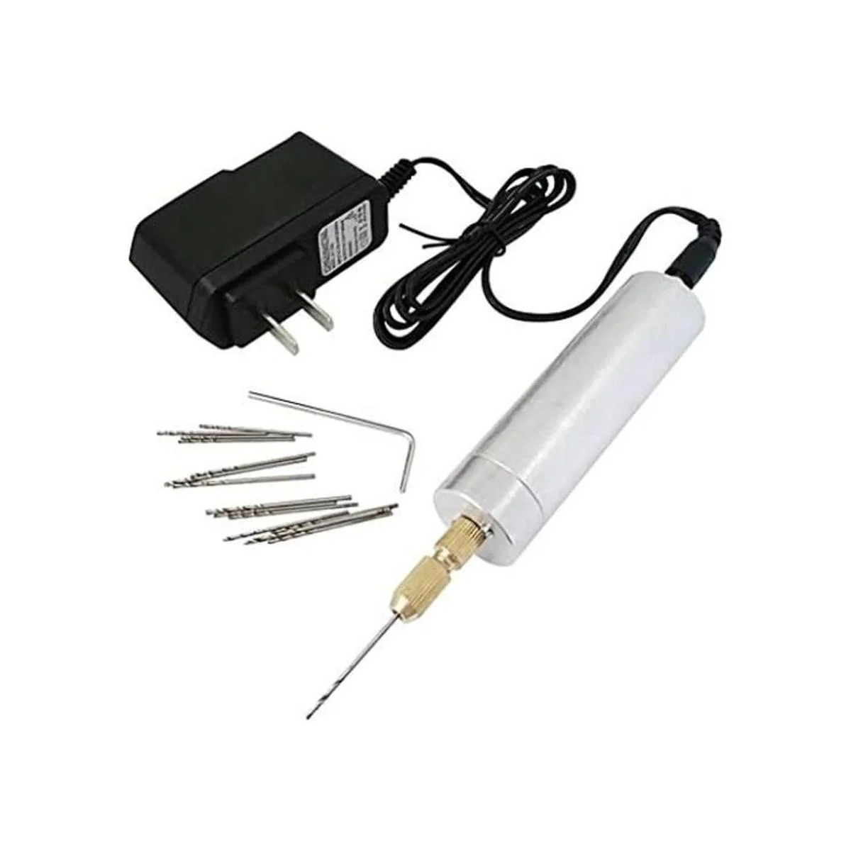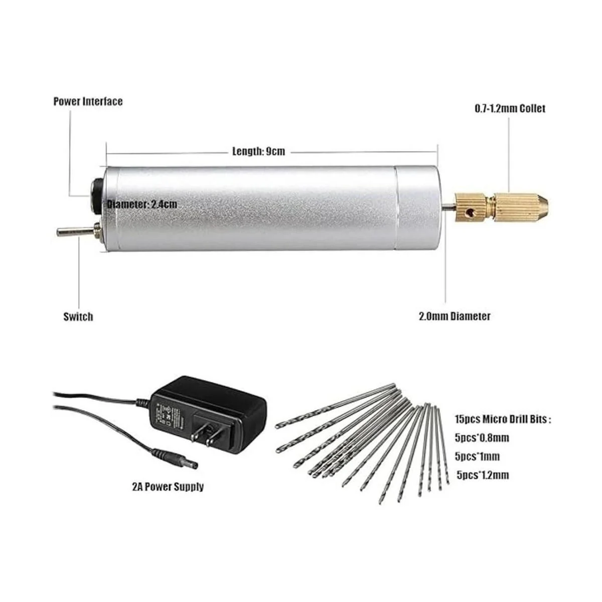 Yakamoz Mini taladro portátil de mano de aluminio micro eléctrico de 0.0280.047 in con 15 brocas, fuente de alimentación de 2 A incluida