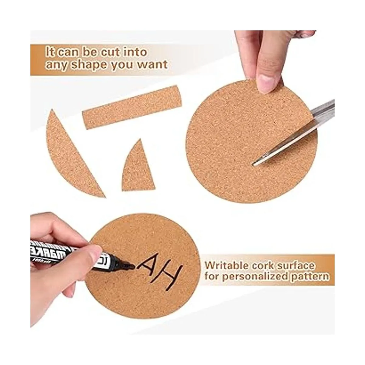 Fácil de cortar: las hojas adhesivas de corcho son suaves y flexibles, lo que es fácil de cortar en cualquier forma que desees, además, también son adecuadas para pegar a la madera, cerámica o azulejos de vidrio, a posavasos de bricolaje, pueden desempeñar un buen papel en el aislamiento térmico, adecuado para colocar tazas u otros artículos