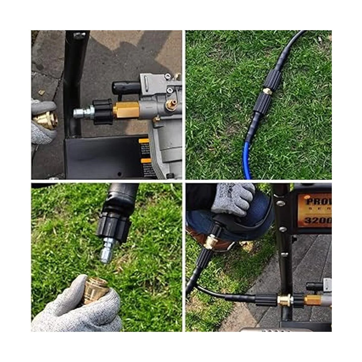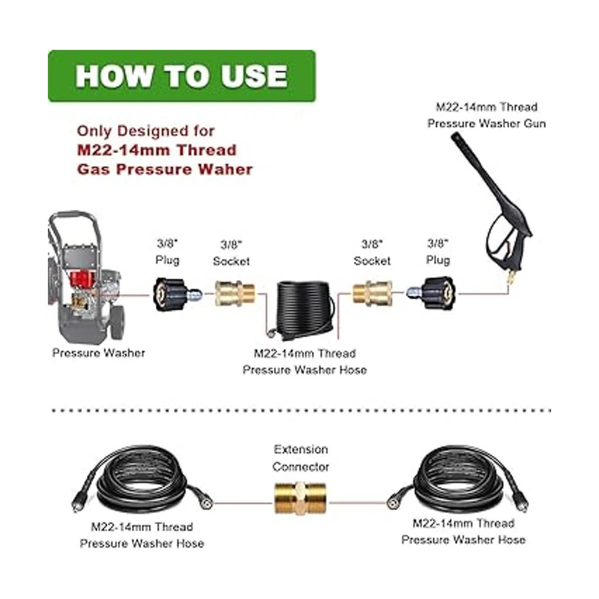 Acopladores de conector rápido 5 en 1: vienen con 5 adaptadores 2 conectores M22 14 mm hembra x conectores de 3/8, 2 conectores rápidos de 3/8x 14 mm macho 1 de 14 mm macho x 14 mm macho, fáciles de conectar con una arandela a presión y . No hay necesidad de atornillar la manguera de lavado cada vez. El ajuste de 14 mm X 14 mm facilita conectar la extensión y te ahorra el tiempo de mover la arandela. Nota: No es compatible con Sun Joe.