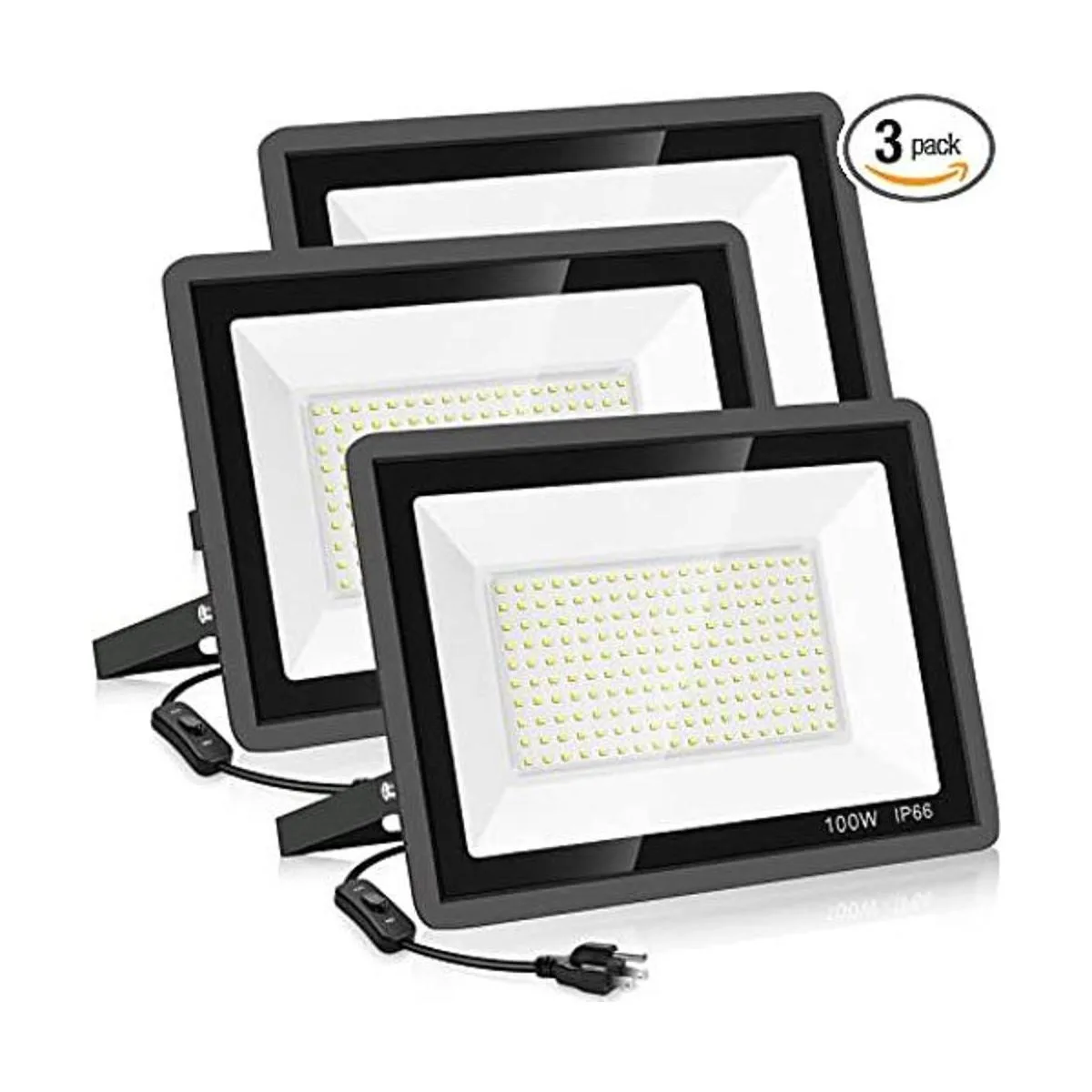 YANYCN Paquete de 3 luces de inundación LED de 100 W para exteriores, súper brillantes luces de seguridad de 11600 lm con enchufe, impermeable IP66 5000 K luz diurna blanca para cancha de baloncesto, patio, jardín, parque infantil