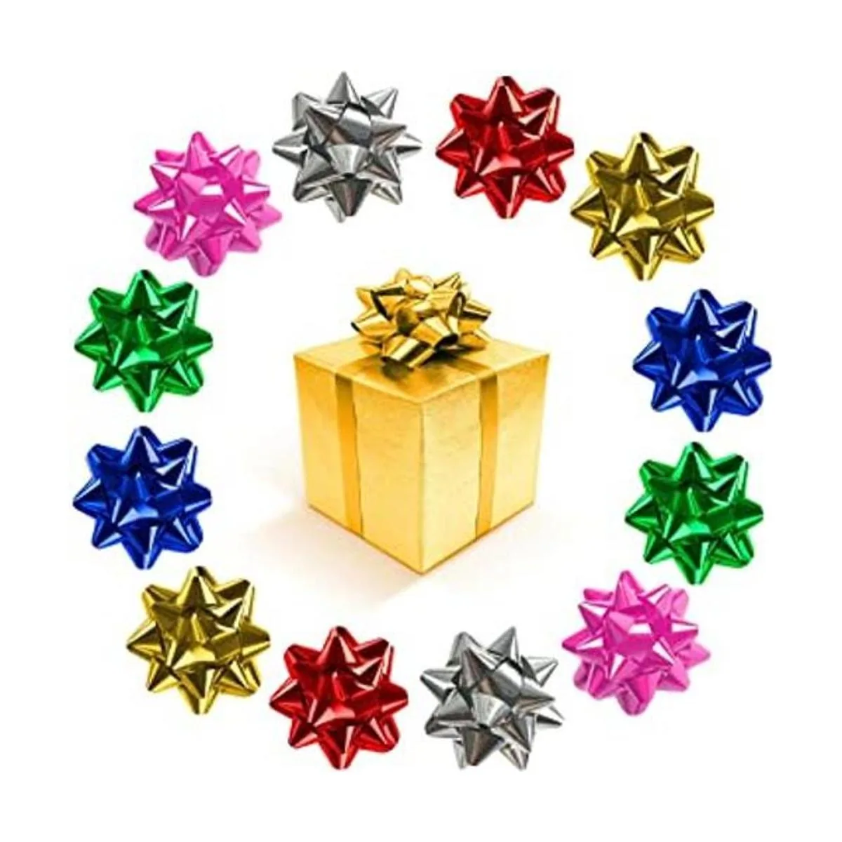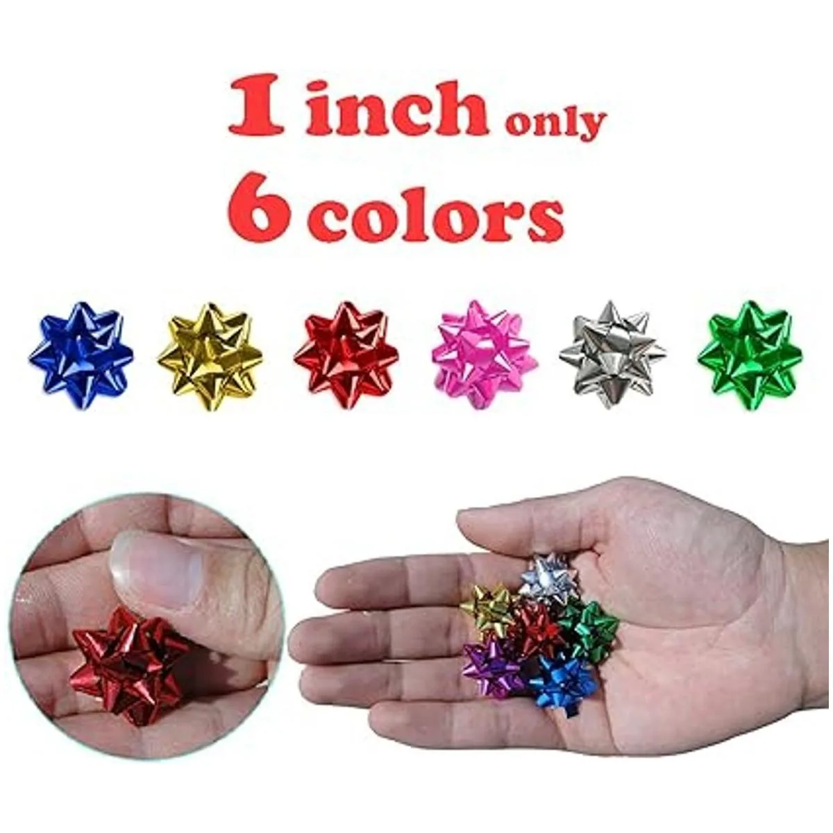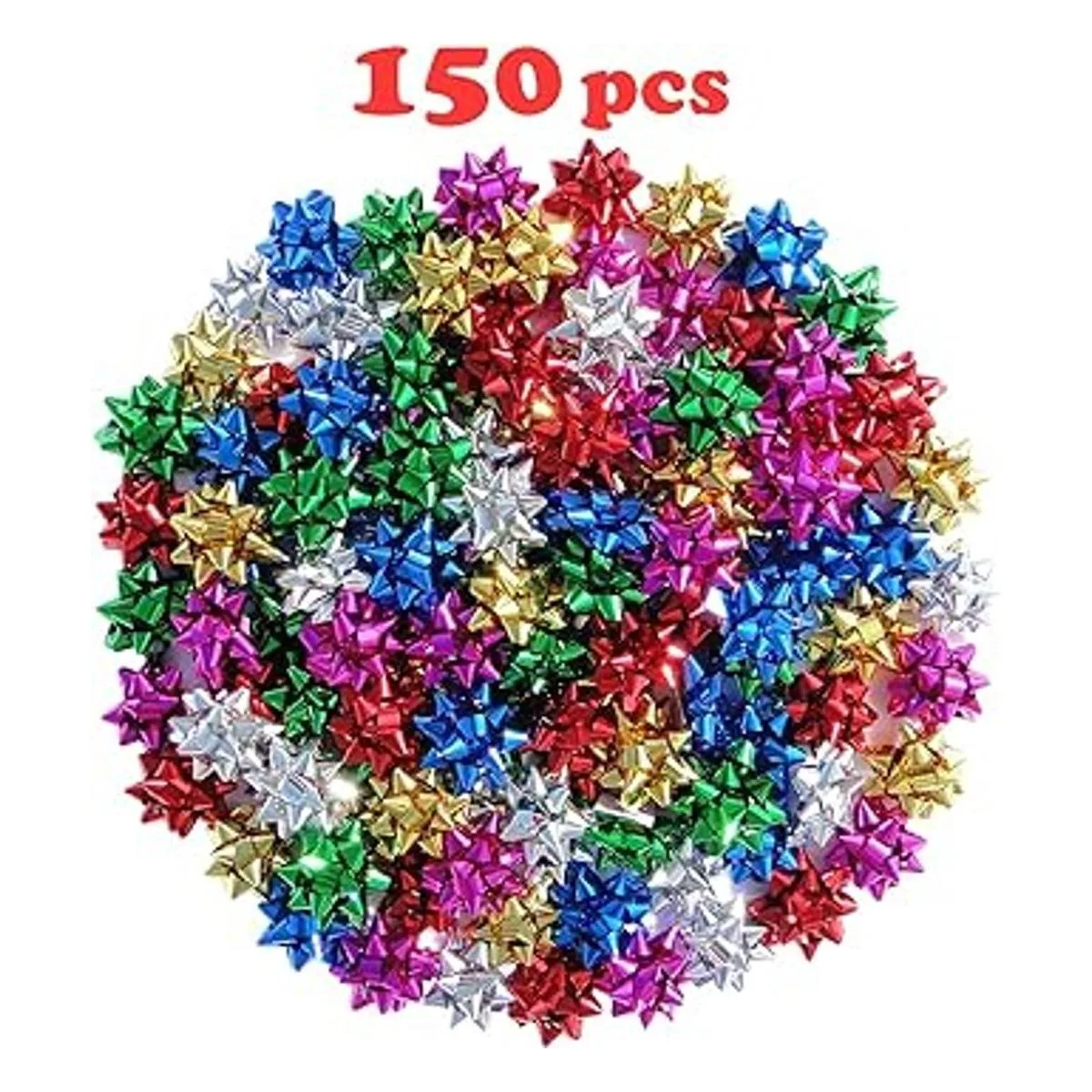 Varios colores opcionales: 6 pequeños lazos surtidos en forma de estrella: rojo, azul, verde, plata, oro y rosa roja en total 150 unidades.