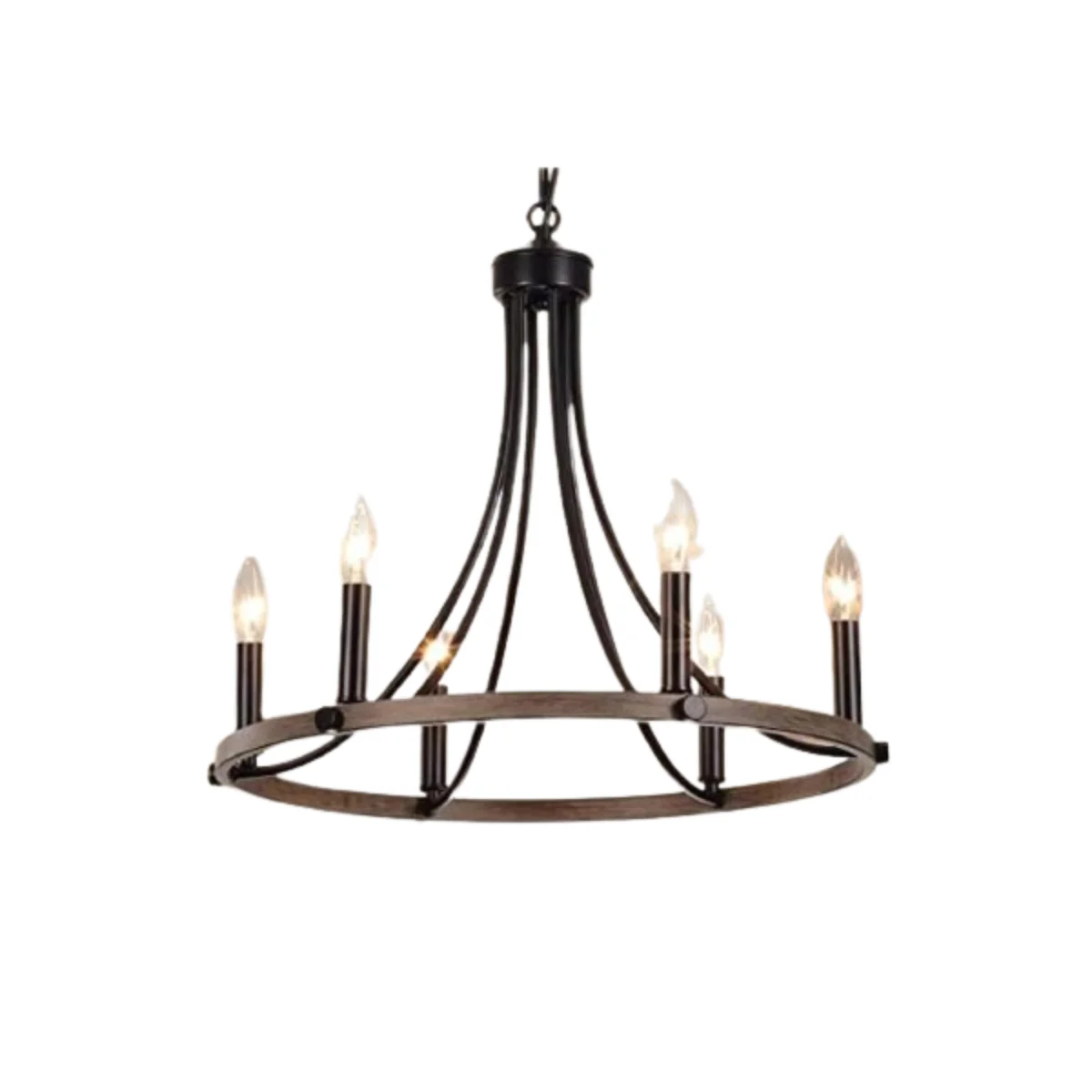 Lámpara de araña única de rueda de vagón: nuestra lámpara de araña negra de granja está diseñada con una forma única de rueda de 6 luces, puede hacer que tu casa brille en todas las direcciones. La superficie de la rueda es similar al grano de madera, no hay duda de que es un símbolo de belleza