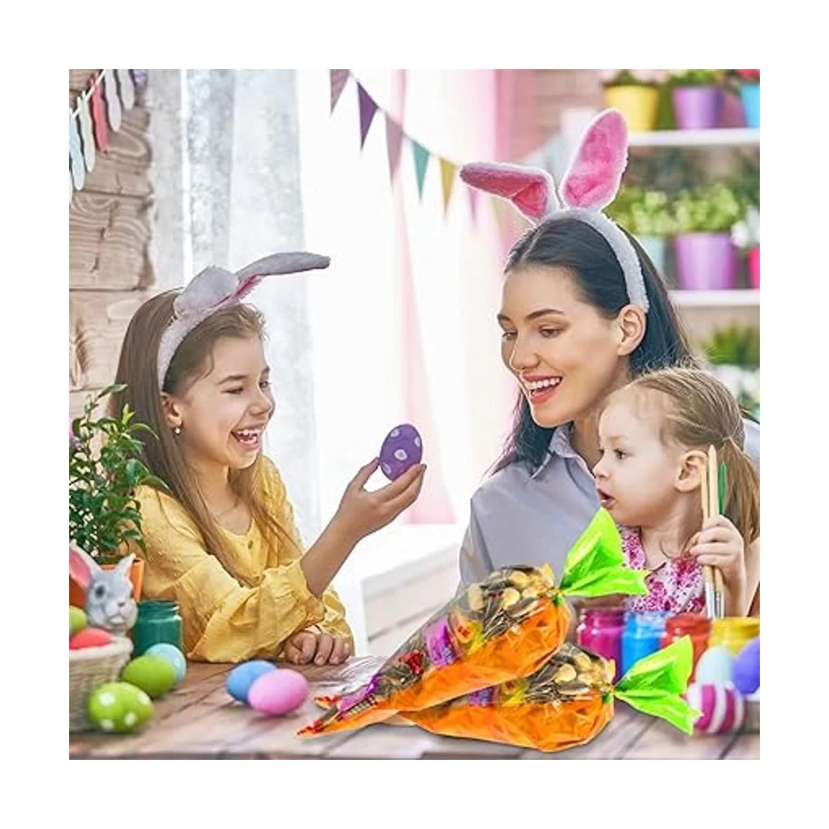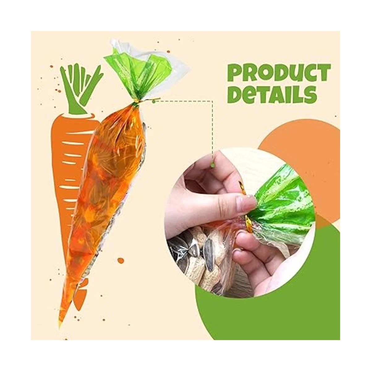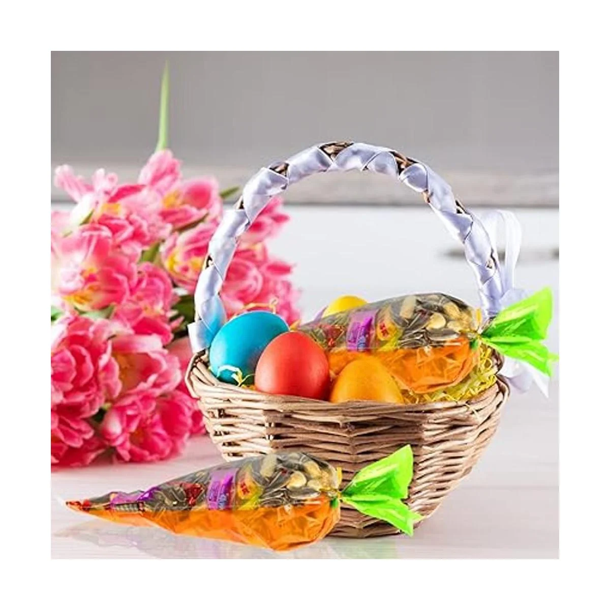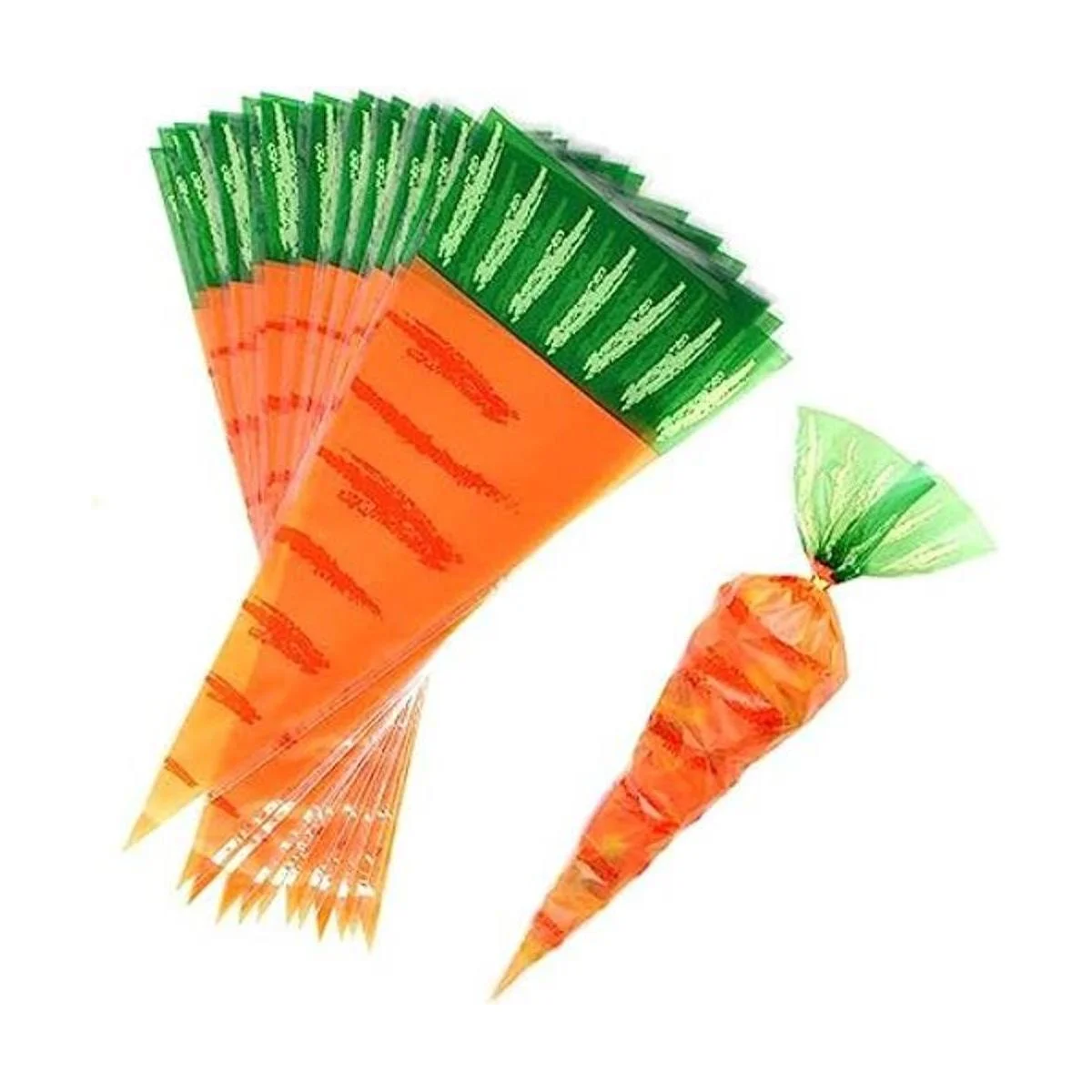 Cantidad y tamaño: 100 bolsas de celofán con diseño de zanahoria de Pascua, el tamaño de la bolsa de cono transparente es de 7.1 x 15.4 in para regalo de fiesta de Pascua, la cantidad puede satisfacer tus diversas necesidades para envolver dulces, aperitivos, chocolates, palomitas de maíz, malvavisco, etc.