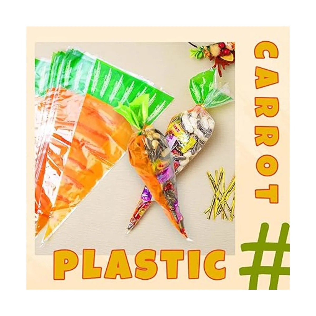 Diseño de Pascua: estas bolsas de celofán están diseñadas con patrón de zanahoria, suaves y duraderas, en naranja con verde, lo que puede añadir un ambiente de Pascua