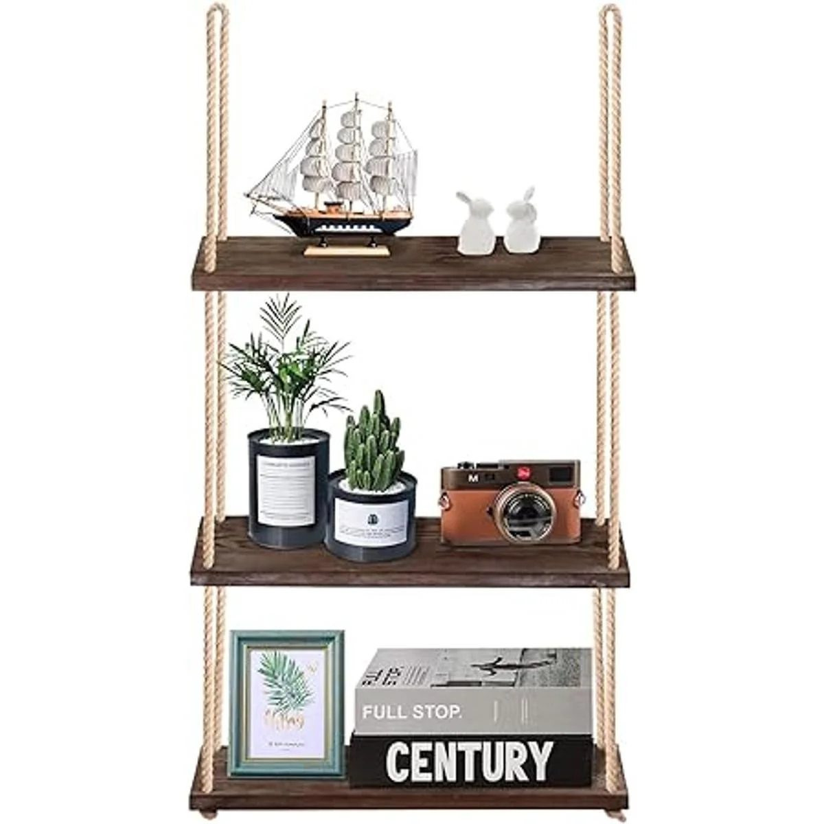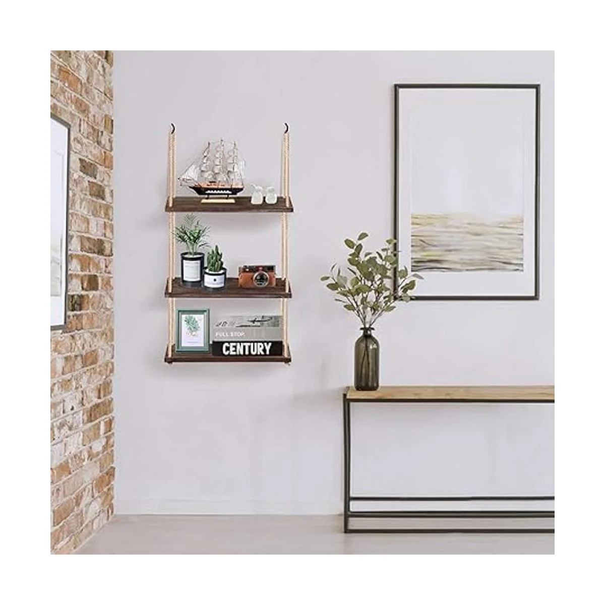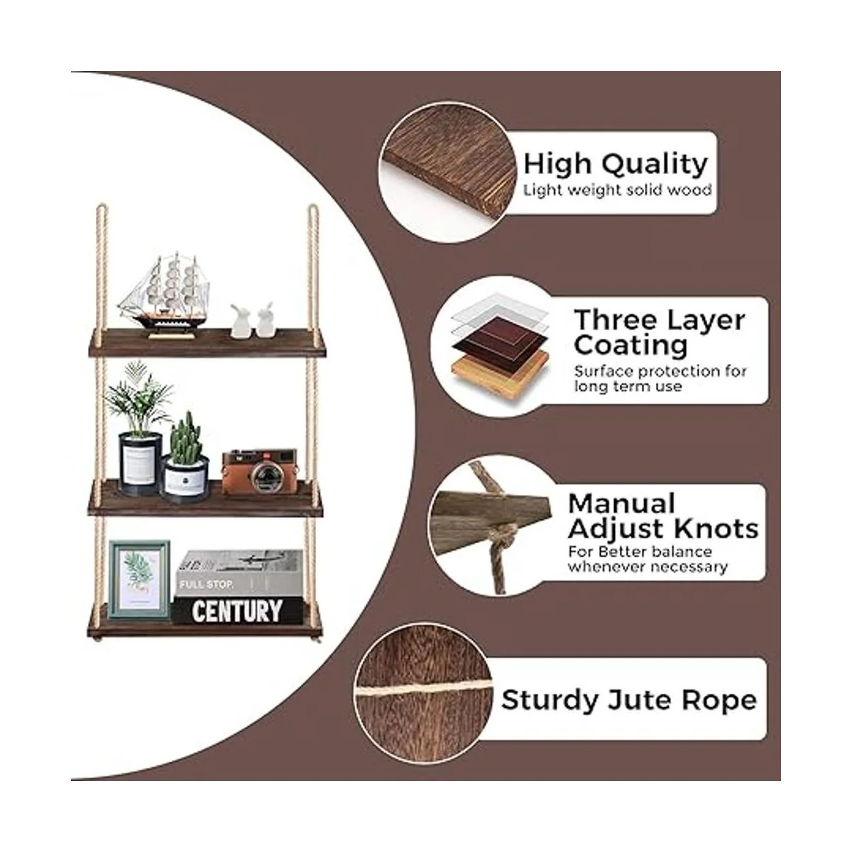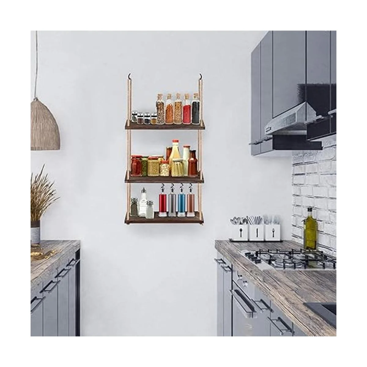Estantes colgantes de pared hechos para durar: hechos de madera gruesa de paulownia marrón oscuro y cuerda de yute ecológica, estos estantes flotantes de cocina con los 3 niveles rectangulares de 16.5 x 7.9 x 0.6 in son únicos y duraderos.