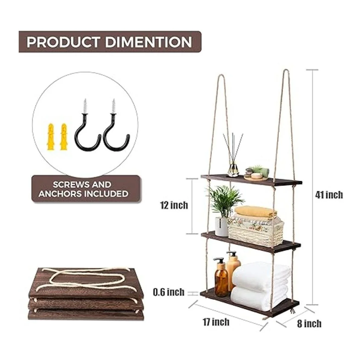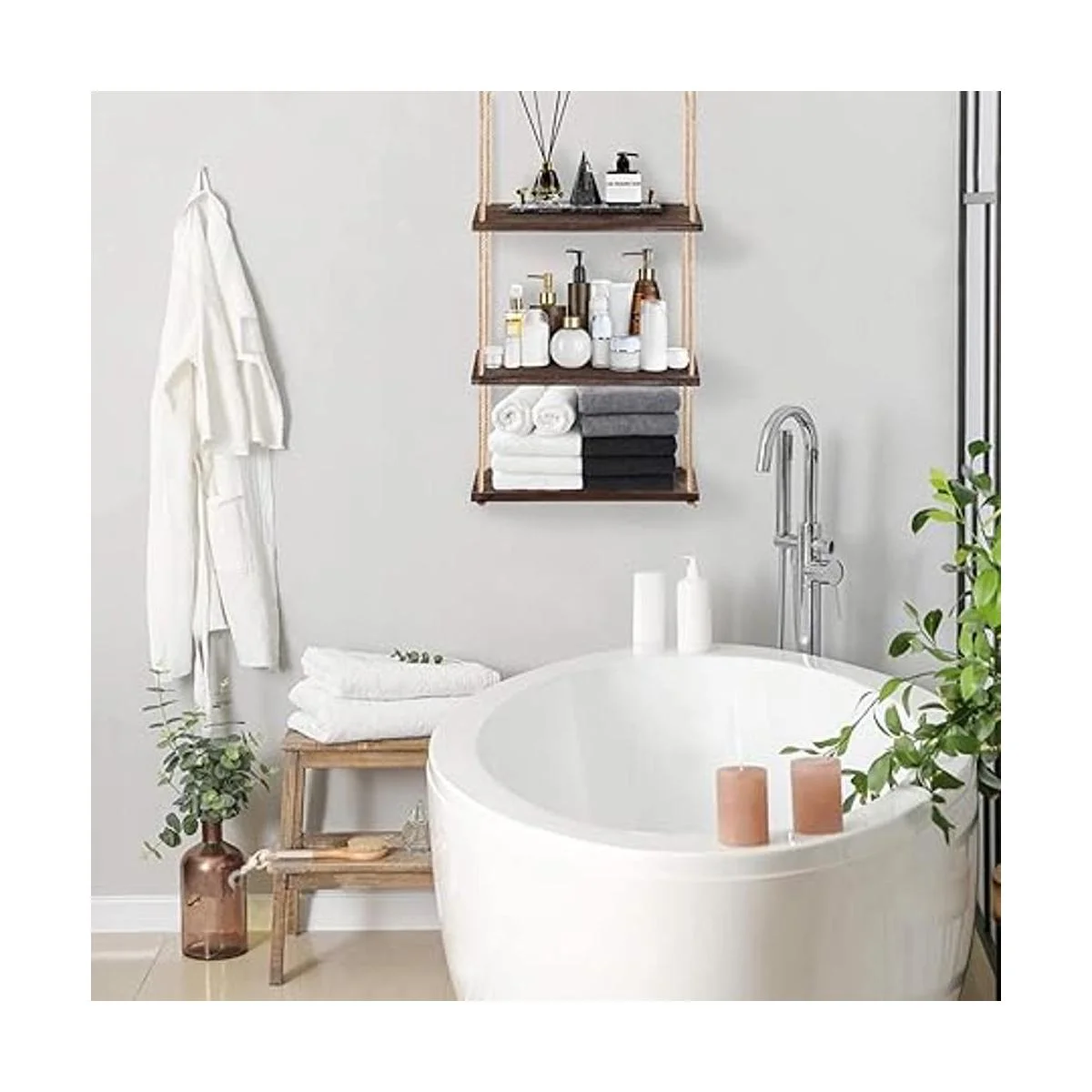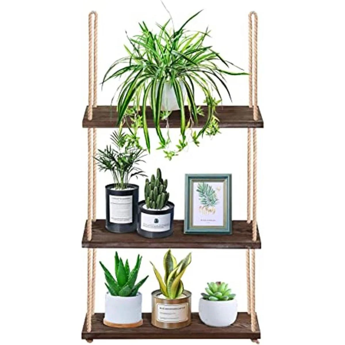 Yazoo Estante colgante para plantas Estante bohemio de 3 niveles para ventana de pared para plantas interiores Estante de cuerda colgante de madera Percha para plantas de ventana, hogar, casa rural baño, decoración de dormitorio rústico